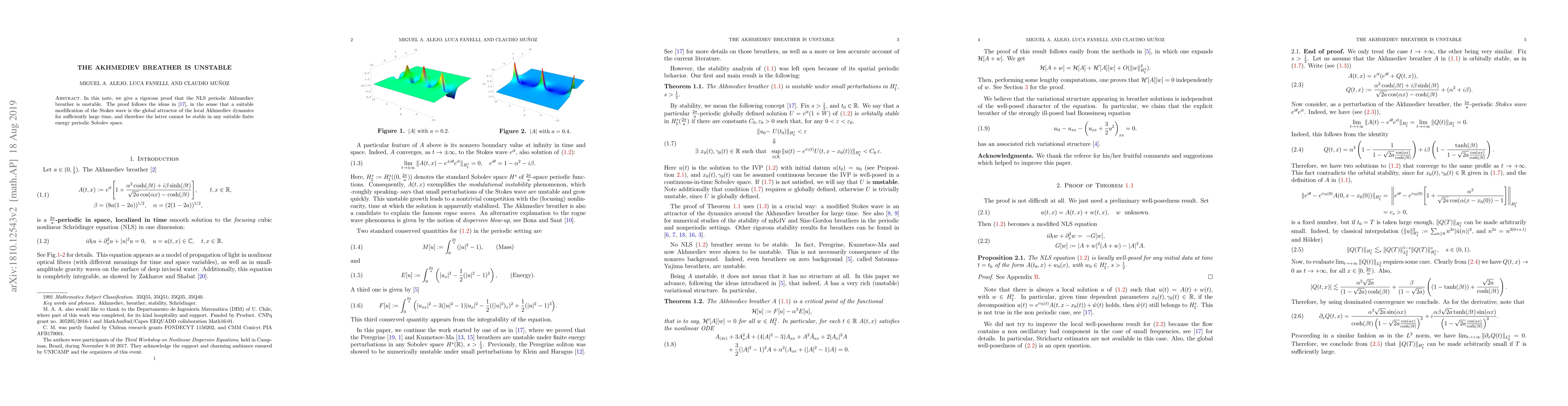 The paper rigorously proves the instability of the NLS periodic Akhmediev breather by demonstrating that a modified Stokes wave acts as the global attractor for the local dynamics, invalidating its stability in finite energy periodic Sobolev spaces.