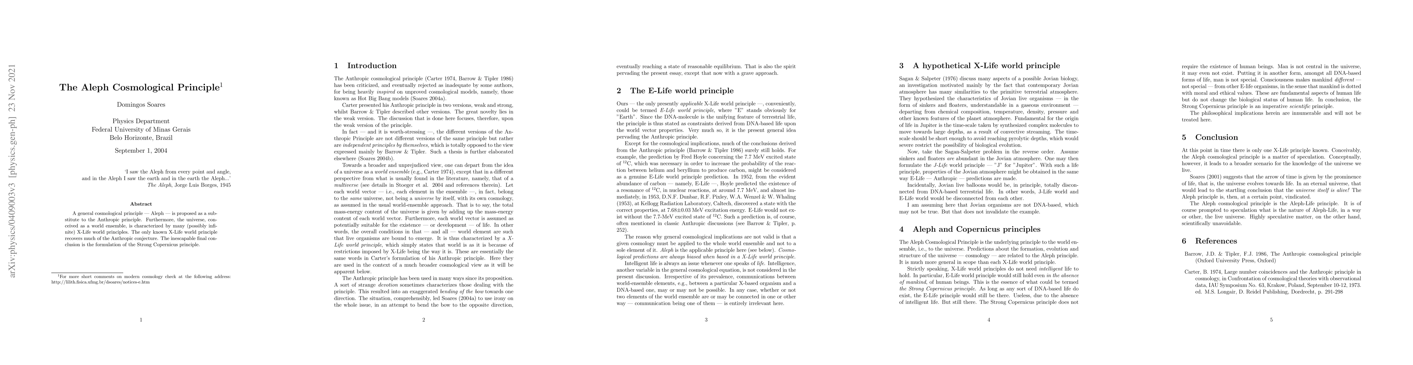The paper introduces the Aleph Cosmological Principle as an alternative to the Anthropic Principle, proposing a universe described by numerous (potentially infinite) X-Life world principles. It concludes with the Strong Copernican Principle, suggesting a more universal perspective in cosmology.