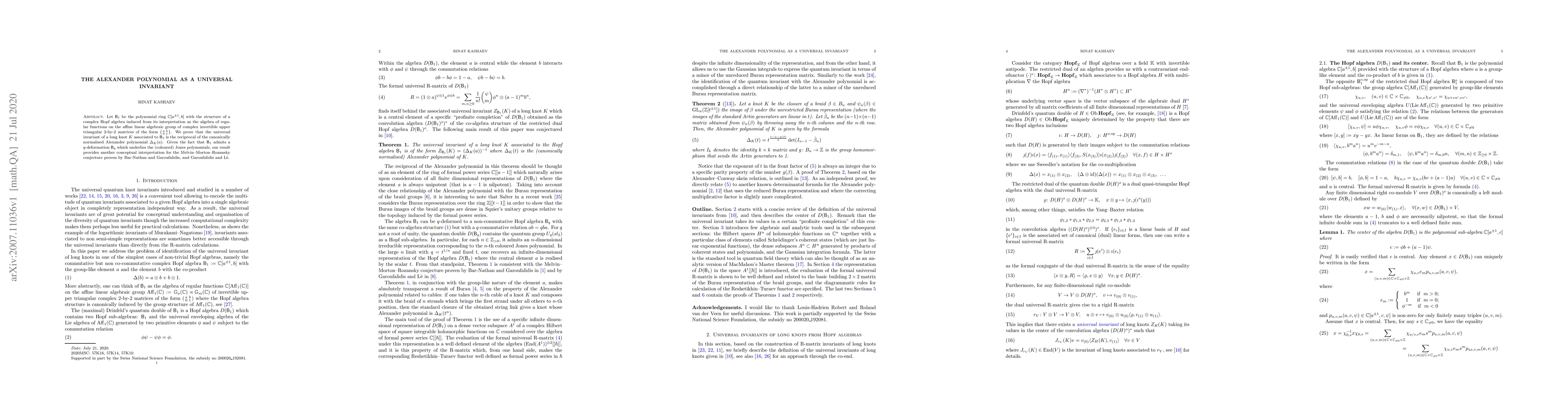 Let $\mathsf{B}_1$ be the polynomial ring $\mathbb{C}[a^{\pm1},b]$ with the structure of a complex Hopf algebra induced from its interpretation as the algebra of regular functions on the affine linear algebraic group of complex invertible upper triangular 2-by-2 matrices of the form $\left( \begin{smallmatrix} a&b\\0&1 \end{smallmatrix}\right)$. We prove that the universal invariant of a long knot $K$ associated to $\mathsf{B}_1$ is the reciprocal of the canonically normalised Alexander polynomial $\Delta_K(a)$. Given the fact that $\mathsf{B}_1$ admits a $q$-deformation $\mathsf{B}_q$ which underlies the (coloured) Jones polynomials, our result provides another conceptual interpretation for the Melvin--Morton--Rozansky conjecture proven by Bar-Nathan and Garoufalidis, and Garoufalidis and L\^e.