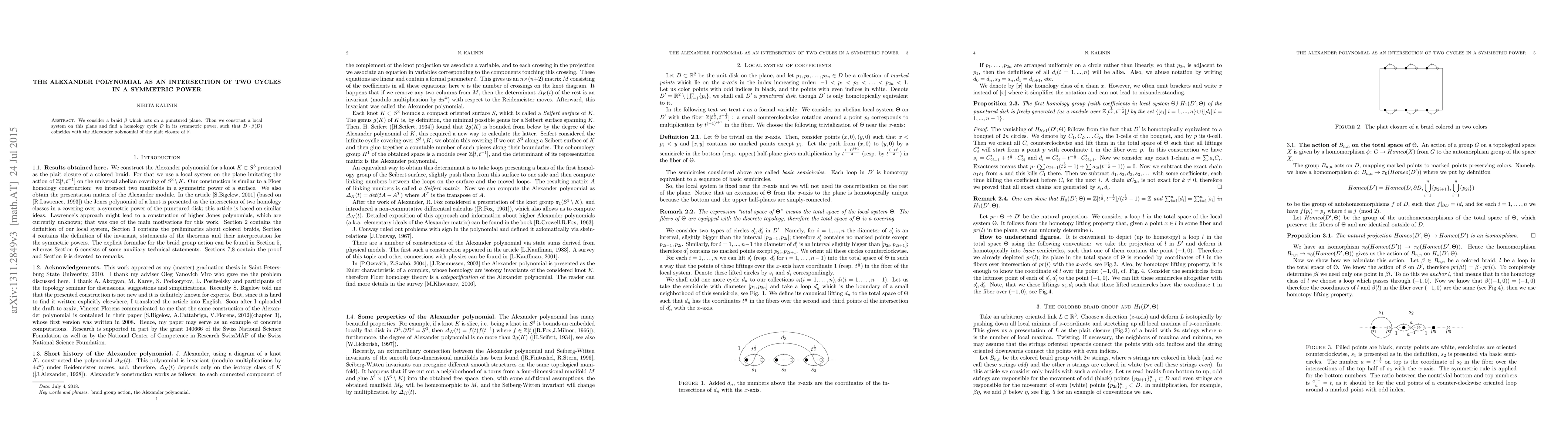 We consider a braid $\beta$ which acts on a punctured plane. Then we construct a local system on this plane and find a homology cicle $D$ in its symmetric power such that $D\cdot \beta(D)$ coincides with the Alexander polynomial of the plate closure of $\beta$.