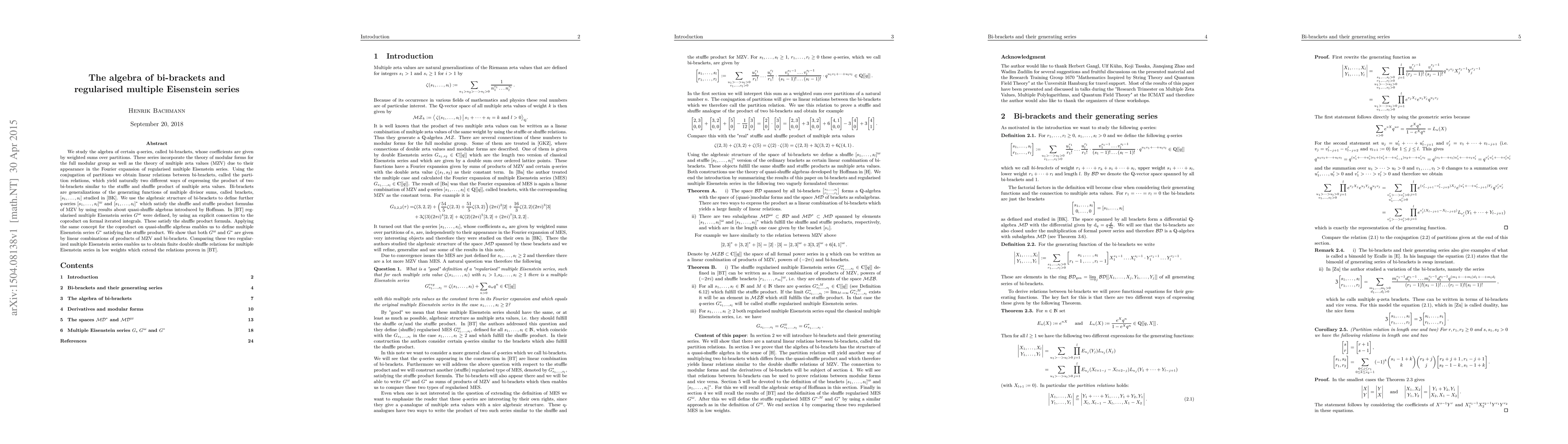 We study the algebra of certain $q$-series, called bi-brackets, whose coefficients are given by weighted sums over partitions. These series incorporate the theory of modular forms for the full modular group as well as the theory of multiple zeta values (MZV) due to their appearance in the Fourier expansion of regularised multiple Eisenstein series. Using the conjugation of partitions we obtain linear relations between bi-brackets, called the partition relations, which yield naturally two different ways of expressing the product of two bi-brackets similar to the stuffle and shuffle product of multiple zeta values. Bi-brackets are generalizations of the generating functions of multiple divisor sums, called brackets, $[s_1,\dots,s_l]$ studied by the author and U. K\"uhn. We use the algebraic structure of bi-brackets to define further $q$-series $[s_1,\dots,s_l]^{sh}$ and $[s_1,\dots,s_l]^\ast$ which satisfy the shuffle and stuffle product formulas of MZV by using results about quasi-shuffle algebras introduced by Hoffman. In a recent work the author and K. Tasaka defined regularised multiple Eisenstein series $G^{sh}$, by using an explicit connection to the coproduct on formal iterated integrals. These satisfy the shuffle product formula. Applying the same concept for the coproduct on quasi-shuffle algebras enables us to define multiple Eisenstein series $G^\ast$ satisfying the stuffle product. We show that both $G^{sh}$ and $G^\ast$ are given by linear combinations of products of MZV and bi-brackets. Comparing these two regularized multiple Eisenstein series enables us to obtain finite double shuffle relations for multiple Eisenstein series in low weights which extend the relations proven before.