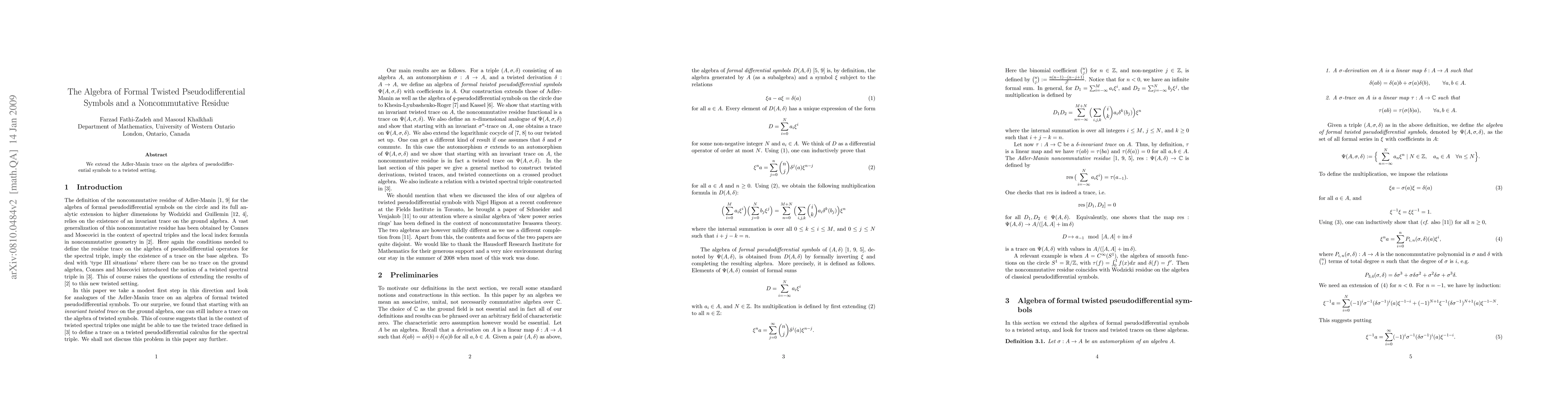 Summary: This paper extends the Adler-Manin trace to the algebra of formal twisted pseudodifferential symbols, introducing a noncommutative residue in the process. The focus is on the algebraic structure and properties of these symbols in a twisted framework.