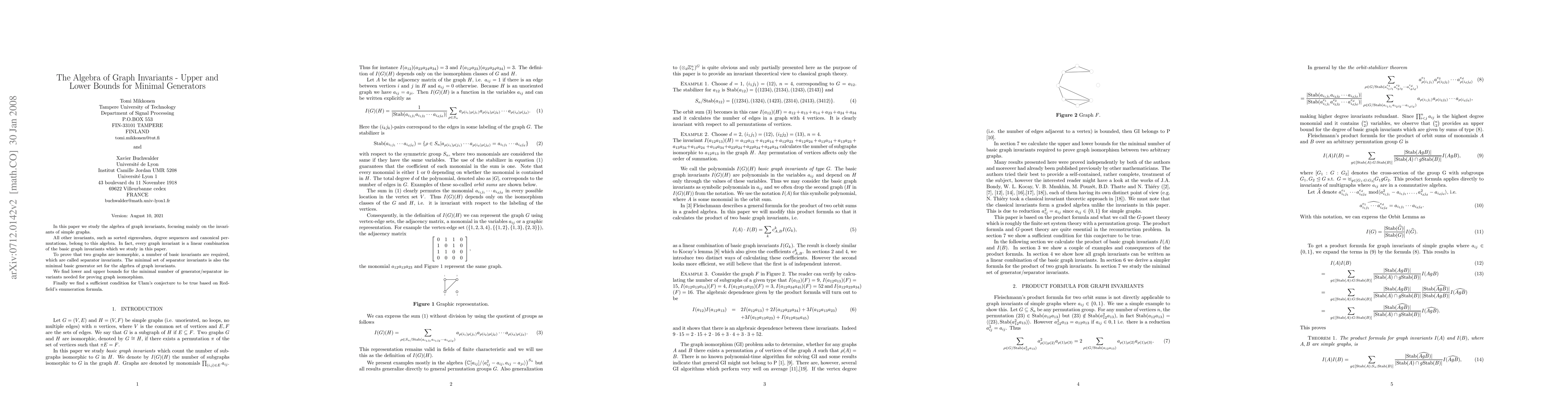 In this paper we study the algebra of graph invariants, focusing mainly on the invariants of simple graphs. All other invariants, such as sorted eigenvalues, degree sequences and canonical permutations, belong to this algebra. In fact, every graph invariant is a linear combination of the basic graph invariants which we study in this paper. To prove that two graphs are isomorphic, a number of basic invariants are required, which are called separator invariants. The minimal set of separator invariants is also the minimal basic generator set for the algebra of graph invariants. We find lower and upper bounds for the minimal number of generator/separator invariants needed for proving graph isomorphism. Finally we find a sufficient condition for Ulam's conjecture to be true based on Redfield's enumeration formula.