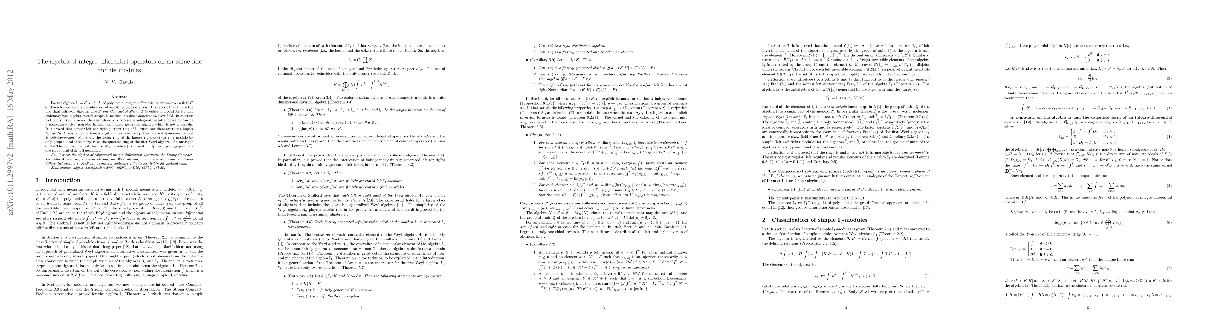 This paper classifies simple modules for the algebra $\mI_1$ of polynomial integro-differential operators over a field of characteristic zero, demonstrating that $\mI_1$ is both left and right coherent. It proves the Strong Compact-Fredholm Alternative for $\mI_1$ and shows that the endomorphism algebra of each simple $\mI_1$-module is a finite-dimensional skew field.