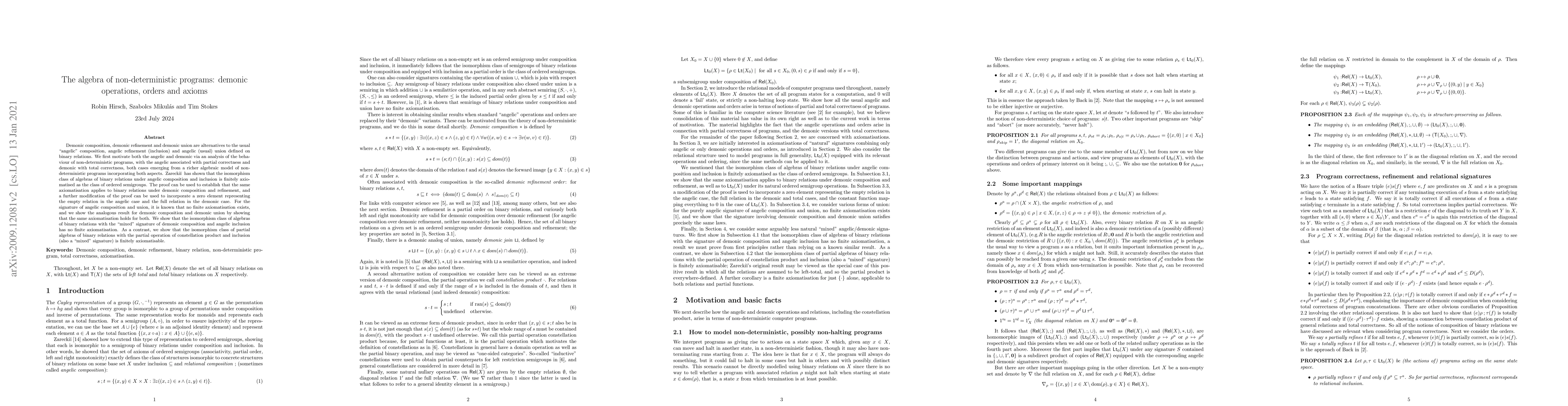 This paper explores the algebraic structures of non-deterministic programs, introducing demonic operators as alternatives to angelic ones. It demonstrates that demonic composition and refinement can be finitely axiomatised, contrasting with the non-axiomatisable nature of angelic composition and union. The study also examines mixed signatures and finds that certain mixed structures are finitely axiomatisable.