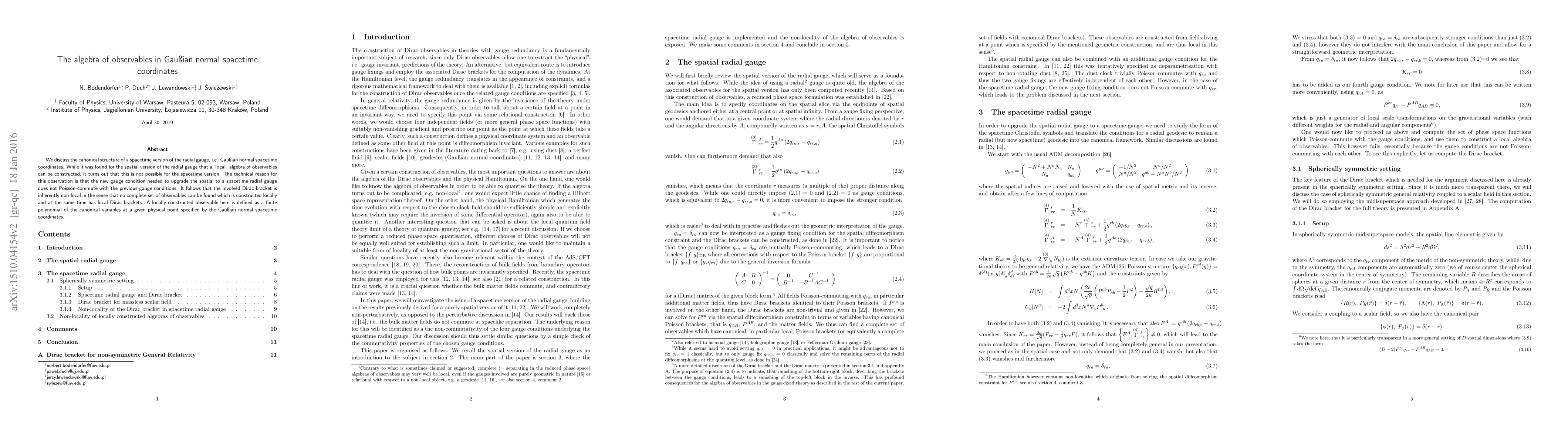 This paper explores the canonical structure of Gau{\ss}ian normal spacetime coordinates in the radial gauge, revealing that unlike the spatial version, a local algebra of observables cannot be constructed. The non-commuting gauge conditions lead to a non-local Dirac bracket, preventing the formation of a complete set of locally defined, yet locally bracketed, observables.