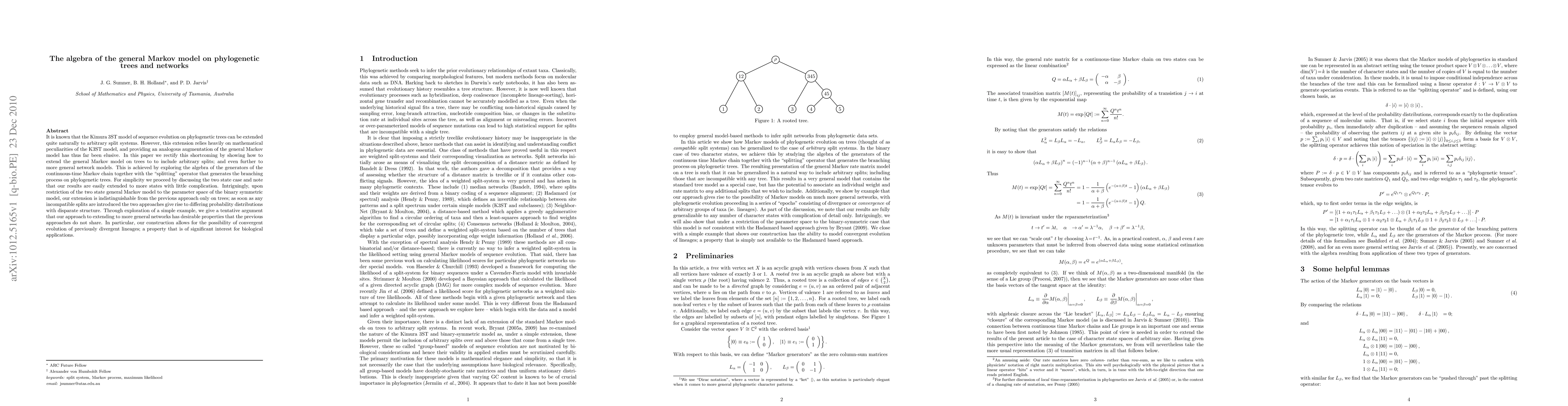It is known that the Kimura 3ST model of sequence evolution on phylogenetic trees can be extended quite naturally to arbitrary split systems. However, this extension relies heavily on mathematical peculiarities of the K3ST model, and providing an analogous augmentation of the general Markov model has thus far been elusive. In this paper we rectify this shortcoming by showing how to extend the general Markov model on trees to to include arbitrary splits; and even further to more general network models. This is achieved by exploring the algebra of the generators of the continuous-time Markov chain together with the "splitting" operator that generates the branching process on phylogenetic trees. For simplicity we proceed by discussing the two state case and note that our results are easily extended to more states with little complication. Intriguingly, upon restriction of the two state general Markov model to the parameter space of the binary symmetric model, our extension is indistinguishable from the previous approach only on trees; as soon as any incompatible splits are introduced the two approaches give rise to differing probability distributions with disparate structure. Through exploration of a simple example, we give a tentative argument that our approach to extending to more general networks has desirable properties that the previous approaches do not share. In particular, our construction allows for the possibility of convergent evolution of previously divergent lineages; a property that is of significant interest for biological applications.