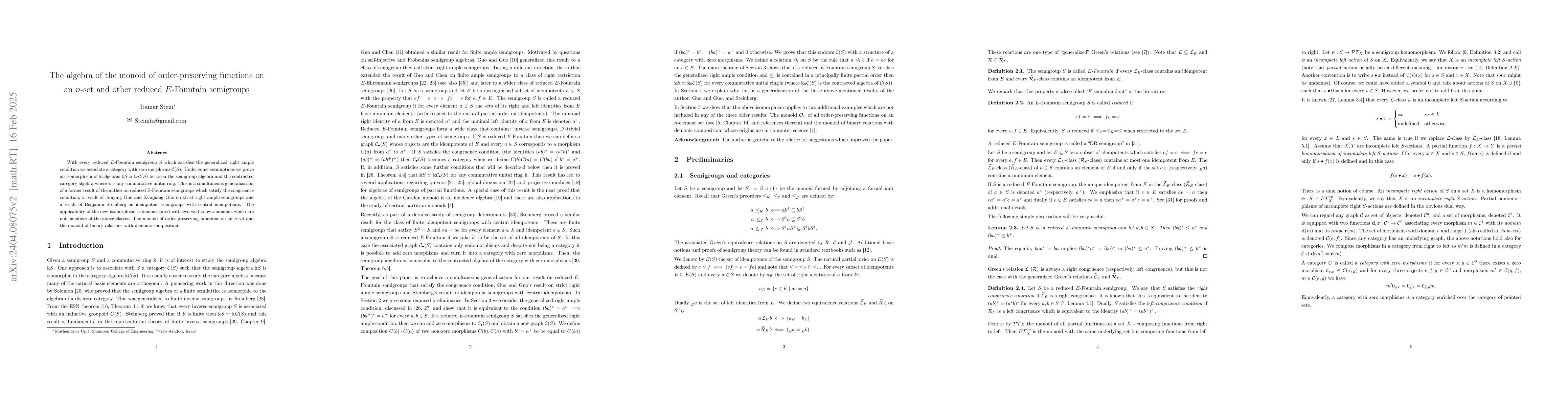 With every reduced $E$-Fountain semigroup $S$ which satisfies the generalized right ample condition we associate a category with partial composition $\mathcal{C}(S)$. Under some assumptions we prove an isomorphism of $\Bbbk$-algebras $\Bbbk S\simeq\Bbbk\mathcal{C}(S)$ between the semigroup algebra and the category algebra where $\Bbbk$ is any commutative unital ring. This is a simultaneous generalization of a former result of the author on reduced E-Fountain semigroups which satisfy the congruence condition, a result of Junying Guo and Xiaojiang Guo on strict right ample semigroups and a result of Benjamin Steinberg on idempotent semigroups with central idempotents. The applicability of the new isomorphism is demonstrated with two well-known monoids which are not members of the above classes. The monoid $\mathcal{O}_{n}$ of order-preserving functions on an $n$-set and the monoid of binary relations with demonic composition.