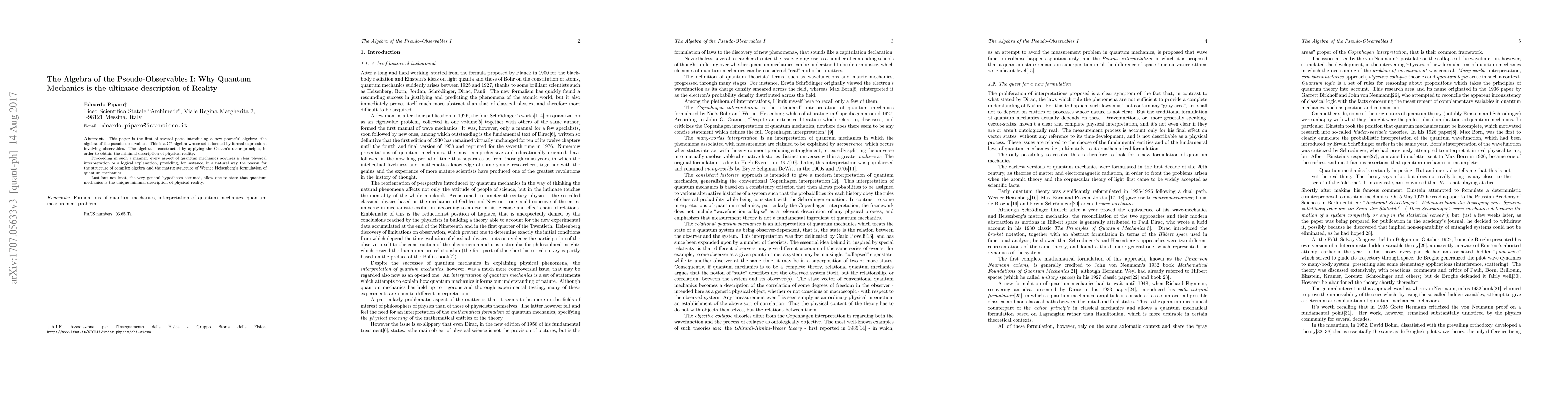 This paper is the first of several parts introducing a new powerful algebra: the algebra of the pseudo-observables. This is a C*-algebra whose set is formed by formal expressions involving observables. The algebra is constructed by applying the Occam's razor principle, in order to obtain the minimal description of physical reality. Proceeding in such a manner, every aspect of quantum mechanics acquires a clear physical interpretation or a logical explanation, providing, for instance, in a natural way the reason for the structure of complex algebra and the matrix structure of Werner Heisenberg's formulation of quantum mechanics. Last but not least, the very general hypotheses assumed, allow one to state that quantum mechanics is the unique minimal description of physical reality.