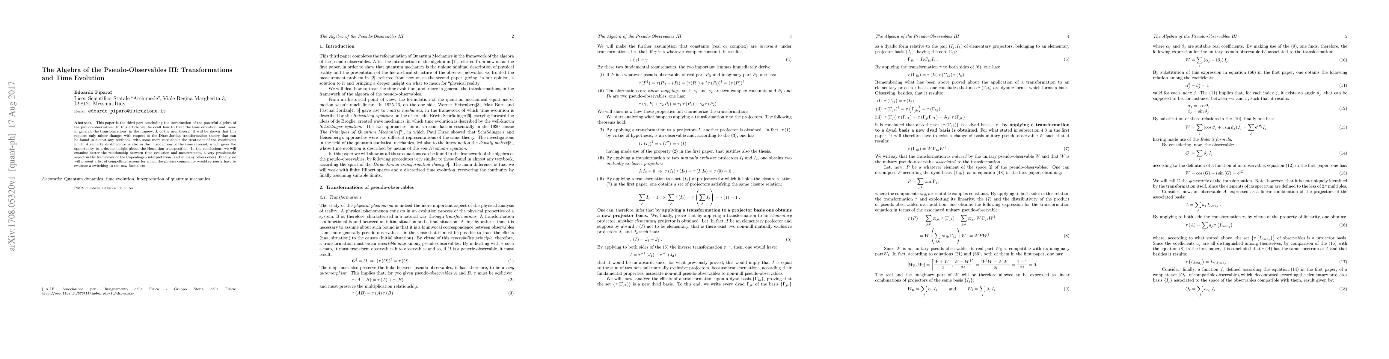 This paper is the third part concluding the introduction of the powerful algebra of the pseudo-observables. In this article will be dealt how to treat the time evolution, and, more in general, the transformations, in the framework of the new theory. It will be shown that this requires only minor changes with respect to the Dirac-Jordan transformation theory that can be found in almost any textbook, with some more care about the treatment of the continuous limit. A remarkable difference is also in the introduction of the time reversal, which gives the opportunity to a deeper insight about the Hermitian transposition. In the conclusions, we will examine better the relationship between time evolution and measurement, a very problematic aspect in the framework of the Copenhagen interpretation (and in many others ones). Finally we will present a list of compelling reasons for which the physics community would seriously have to evaluate a switching to the new formalism.