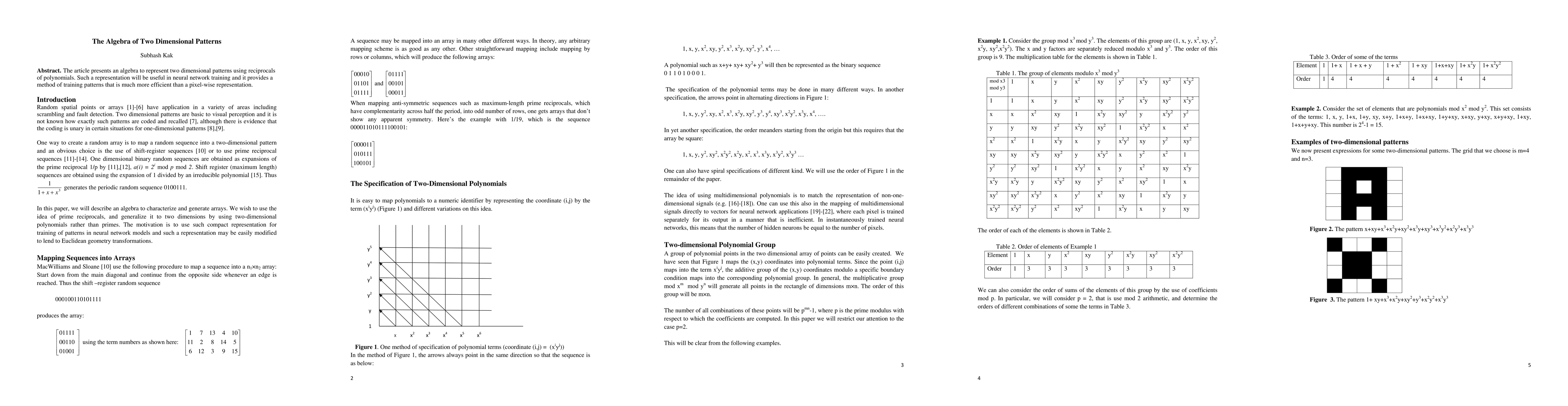 The paper introduces an algebra using reciprocals of polynomials to represent two-dimensional patterns, demonstrated through examples and multiplication tables.