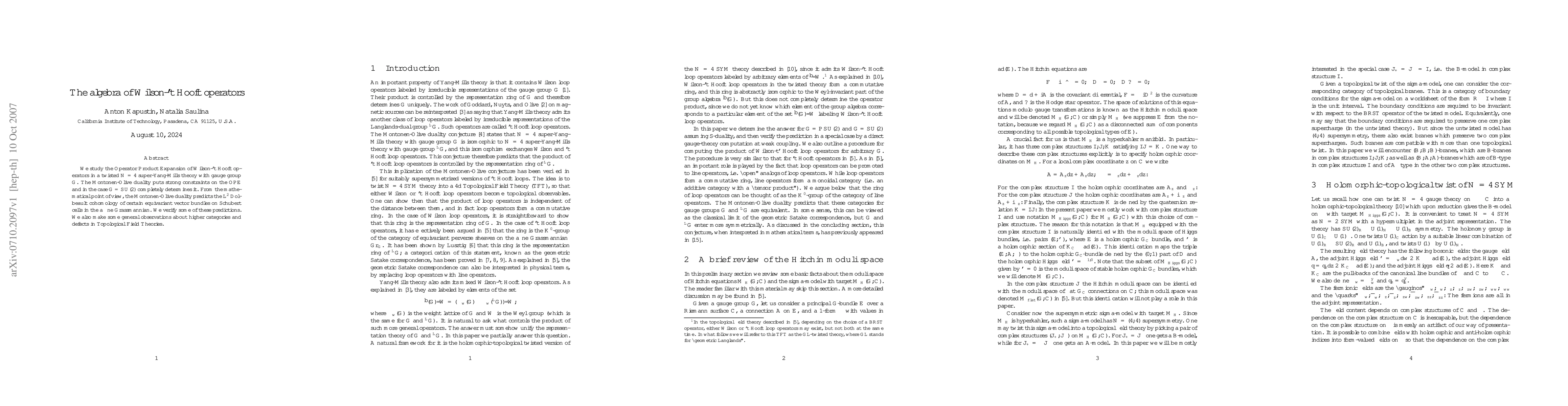 We study the Operator Product Expansion of Wilson-'t Hooft operators in a twisted N=4 super-Yang-Mills theory with gauge group G. The Montonen-Olive duality puts strong constraints on the OPE and in the case G=SU(2) completely determines it. From the mathematical point of view, the Montonen-Olive duality predicts the L^2 Dolbeault cohomology of certain equivariant vector bundles on Schubert cells in the affine Grassmannian. We verify some of these predictions. We also make some general observations about higher categories and defects in Topological Field Theories.