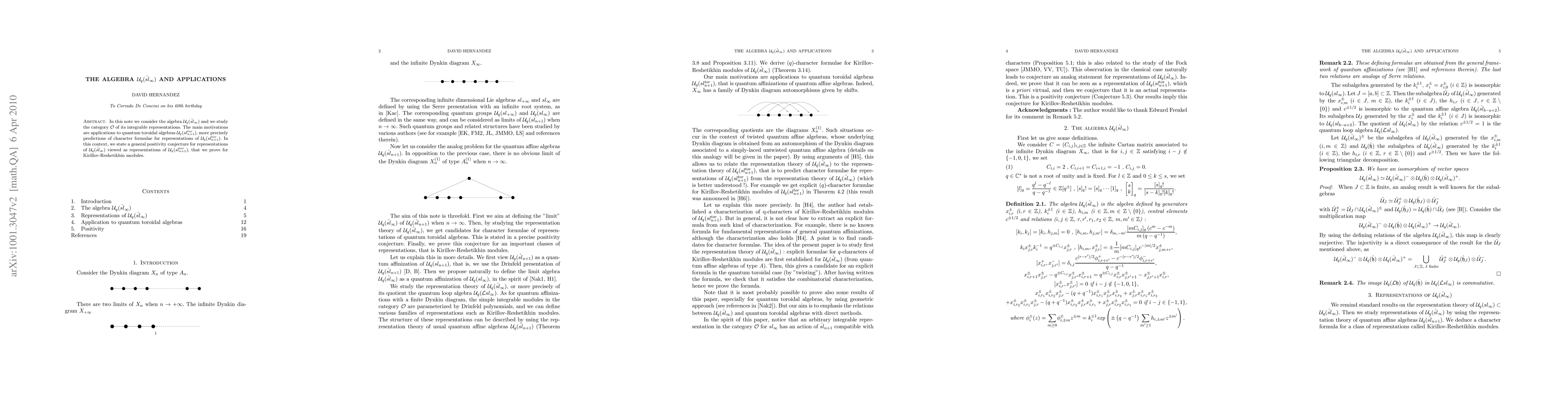 In this note we consider the algebra $U_q(\hat{sl}_\infty)$ and we study the category O of its integrable representations. The main motivations are applications to quantum toroidal algebras, more precisely predictions of character formulae for representations of quantum toroidal algebras. In this context, we state a general positivity conjecture for representations of $U_q(\hat{sl}_\infty)$ viewed as representations of quantum toroidal algebras, that we prove for Kirillov-Reshetikhin modules.