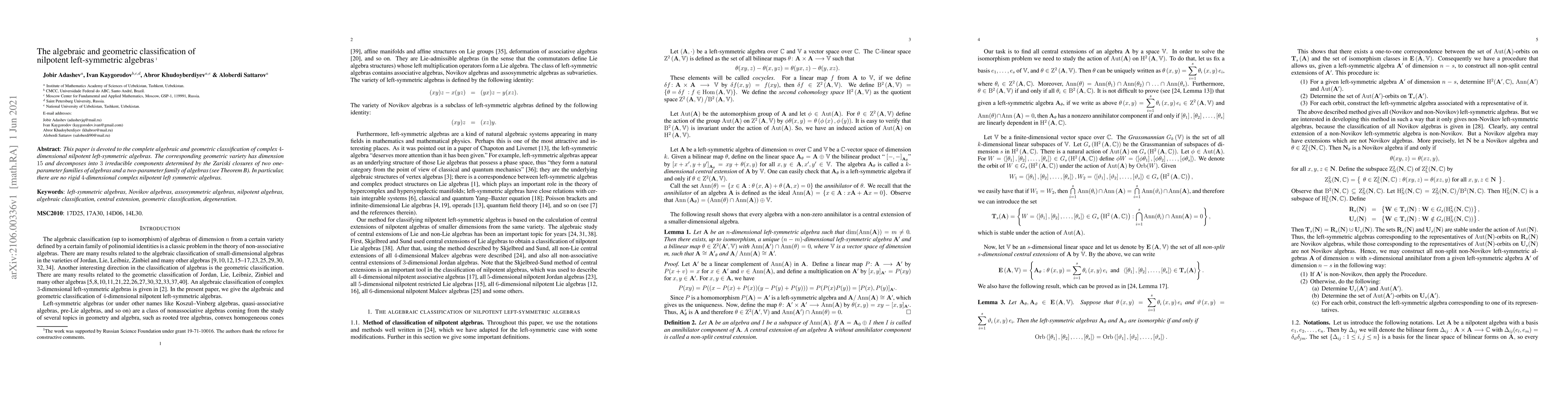 Researchers classified 4-dimensional complex nilpotent left-symmetric algebras into three irreducible components with a total dimension of 15, showing no rigid examples exist.