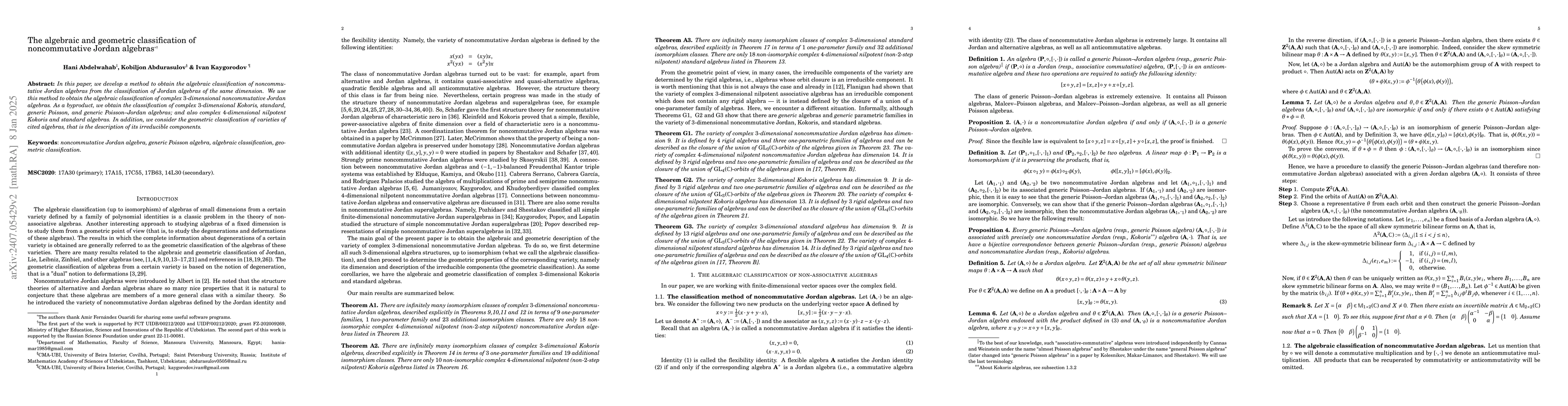 This paper provides an algebraic classification method for noncommutative Jordan algebras, derived from the classification of commutative Jordan algebras, applied to $3$-dimensional complex cases, yielding classifications for Kokoris, standard, generic Poisson, and generic Poisson-Jordan algebras, and $4$-dimensional nilpotent Kokoris and standard algebras, alongside a geometric classification of their irreducible components.