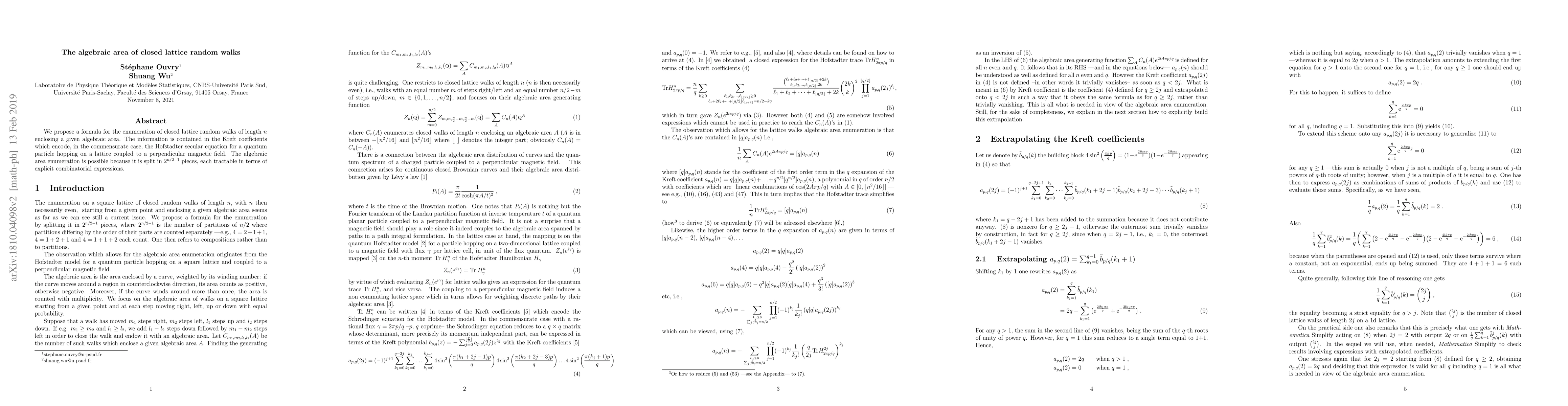We propose a formula for the enumeration of closed lattice random walks of length $n$ enclosing a given algebraic area. The information is contained in the Kreft coefficients which encode, in the commensurate case, the Hofstadter secular equation for a quantum particle hopping on a lattice coupled to a perpendicular magnetic field. The algebraic area enumeration is possible because it is split in $2^{n/2-1}$ pieces, each tractable in terms of explicit combinatorial expressions.