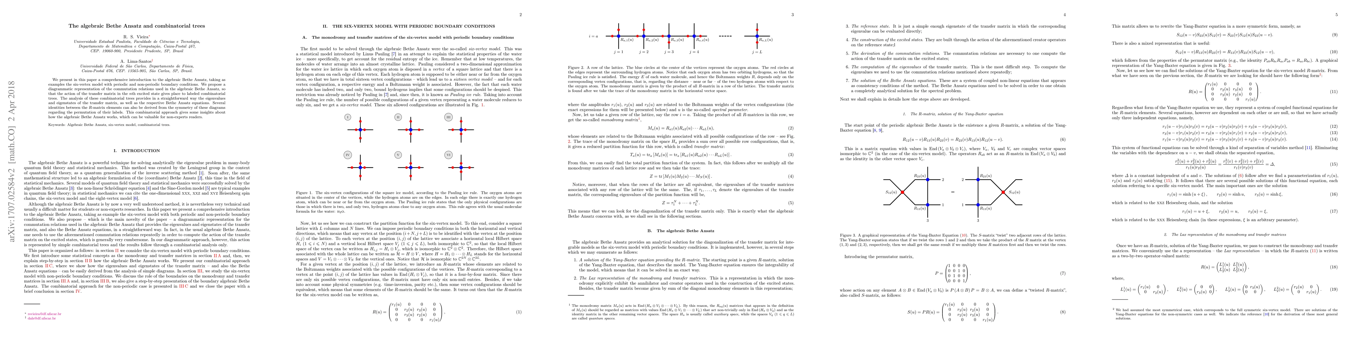 This paper introduces the algebraic Bethe Ansatz using the six-vertex model, proposing a diagrammatic representation of commutation relations that generates labeled combinatorial trees. These trees simplify the analysis of transfer matrix eigenvalues and Bethe Ansatz equations, providing insights for non-expert readers.