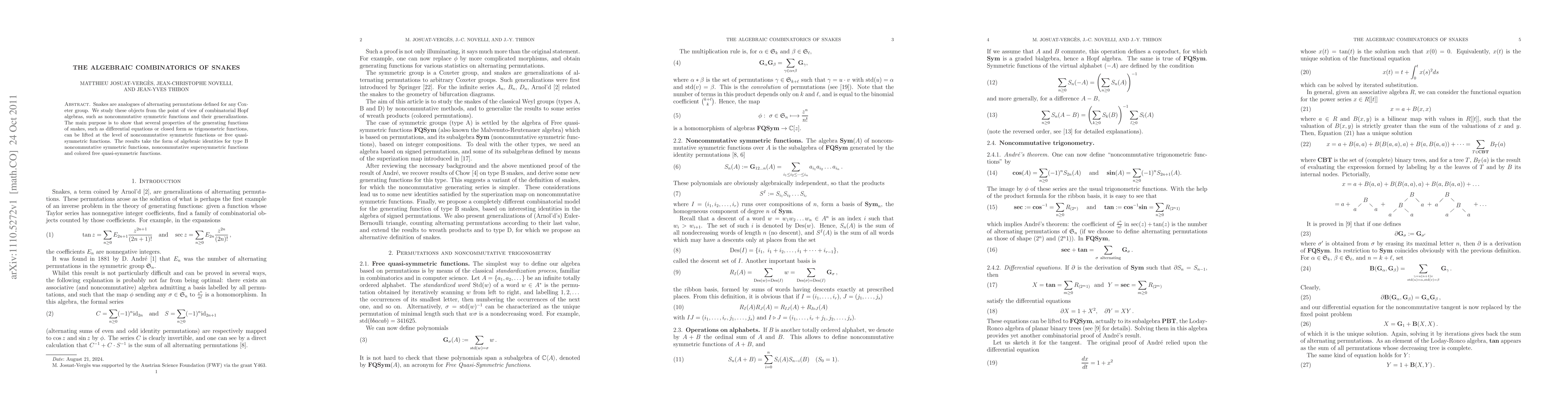 The paper investigates snakes, combinatorial objects analogous to alternating permutations in Coxeter groups, through the lens of combinatorial Hopf algebras. It demonstrates that properties of snakes' generating functions, like differential equations and trigonometric forms, correspond to algebraic identities in noncommutative symmetric functions and related structures.