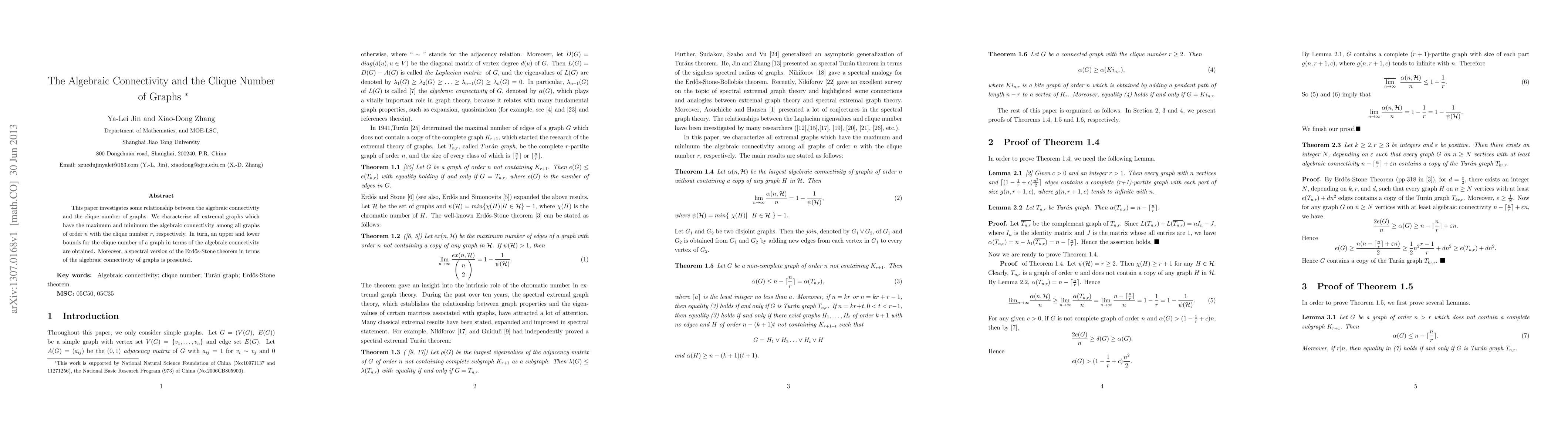 This paper explores the relationship between algebraic connectivity and the clique number in graphs, characterizing extremal graphs based on these properties and deriving bounds for the clique number in terms of algebraic connectivity, along with a spectral version of the Erdős-Stone theorem.