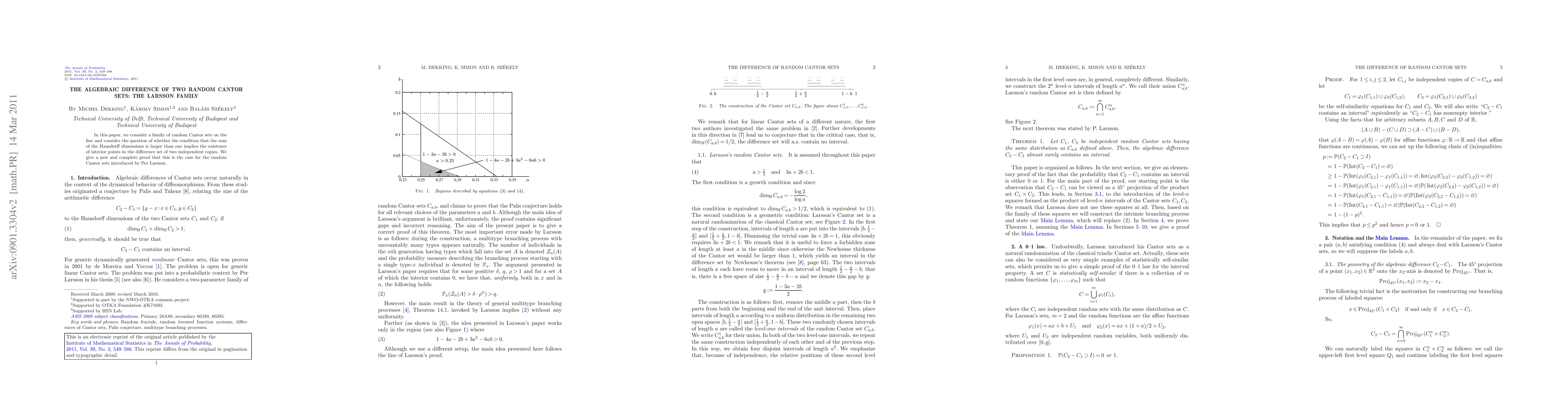 In this paper, we consider a family of random Cantor sets on the line and consider the question of whether the condition that the sum of the Hausdorff dimensions is larger than one implies the existence of interior points in the difference set of two independent copies. We give a new and complete proof that this is the case for the random Cantor sets introduced by Per Larsson.