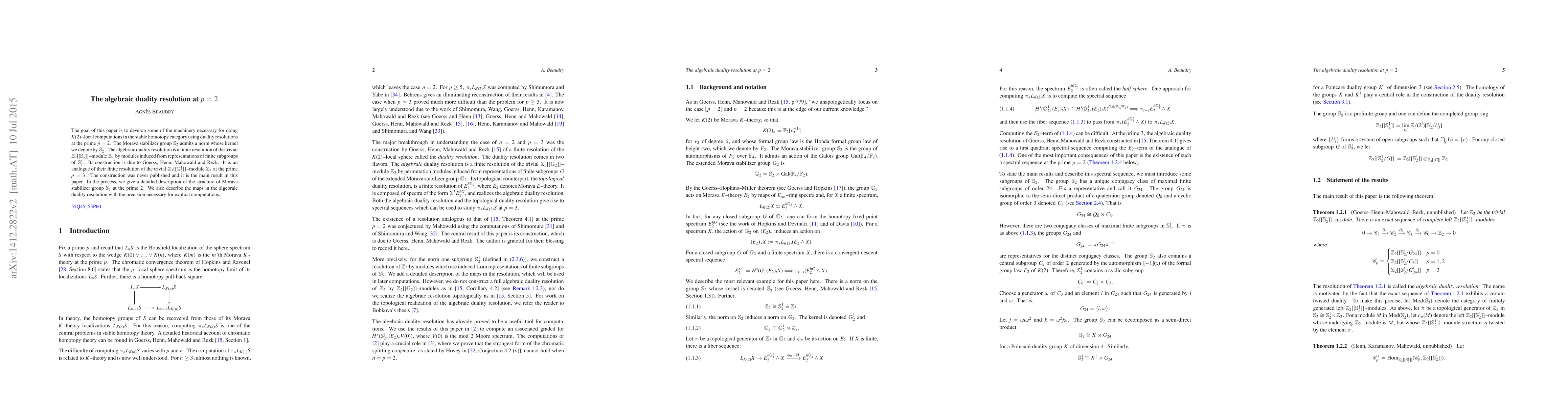 This paper constructs an algebraic duality resolution for $K(2)$-local computations in the stable homotopy category, focusing on the Morava stabilizer group $\mathbb{S}_2$ at the prime $p=2$. It provides a detailed description of the structure of $\mathbb{S}_2$ and precise maps for explicit computations.