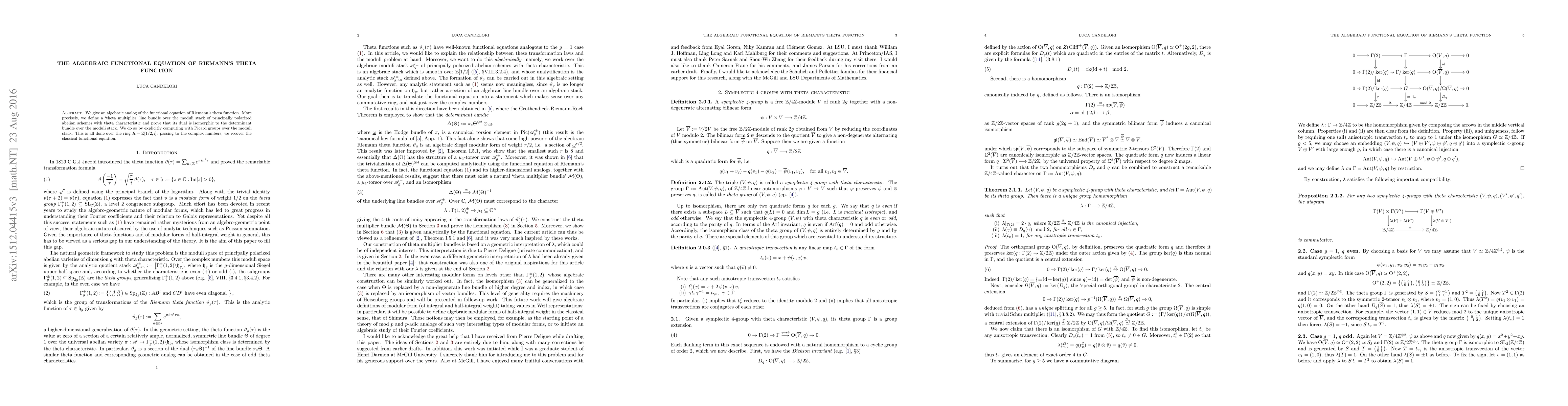 We give an algebraic analog of the functional equation of Riemann's theta function. More precisely, we define a `theta multiplier' line bundle over the moduli stack of principally polarized abelian schemes with theta characteristic and prove that its dual is isomorphic to the determinant bundle over the moduli stack. We do so by explicitly computing with Picard groups over the moduli stack. This is all done over the ring R=Z[1/2,i]: passing to the complex numbers, we recover the classical functional equation.