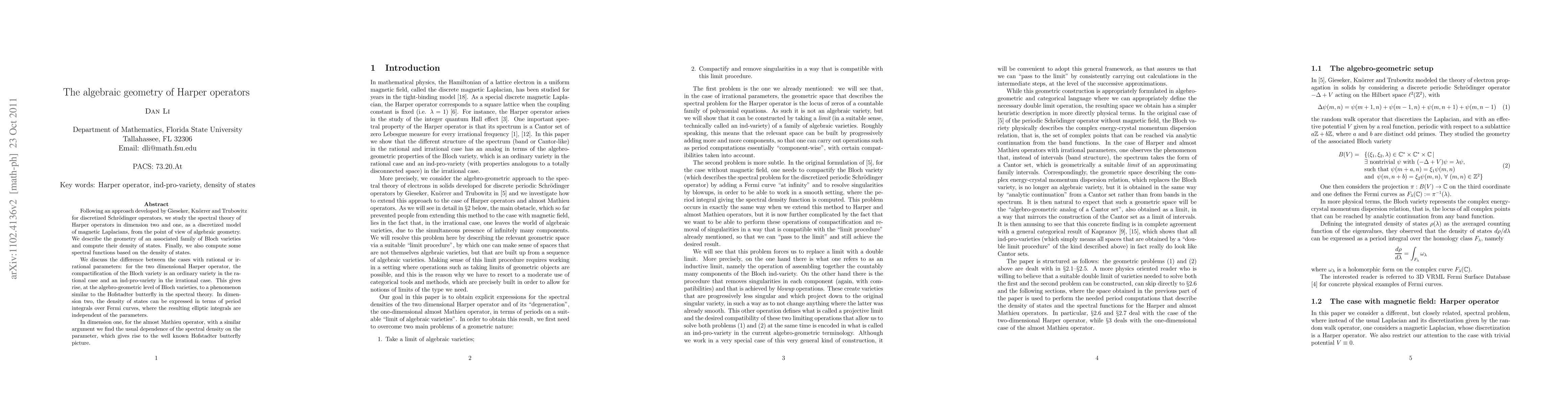 Following an approach developed by Gieseker, Kn\"orrer and Trubowitz for discretized Schr\"odinger operators, we study the spectral theory of Harper operators in dimension two and one, as a discretized model of magnetic Laplacians, from the point of view of algebraic geometry. We describe the geometry of an associated family of Bloch varieties and compute their density of states. Finally, we also compute some spectral functions based on the density of states. We discuss the difference between the cases with rational or irrational parameters: for the two dimensional Harper operator, the compactification of the Bloch variety is an ordinary variety in the rational case and an ind-pro-variety in the irrational case. This gives rise, at the algebro-geometric level of Bloch varieties, to a phenomenon similar to the Hofstadter butterfly in the spectral theory. In dimension two, the density of states can be expressed in terms of period integrals over Fermi curves, where the resulting elliptic integrals are independent of the parameters. In dimension one, for the almost Mathieu operator, with a similar argument we find the usual dependence of the spectral density on the parameter, which gives rise to the well known Hofstadter butterfly picture.