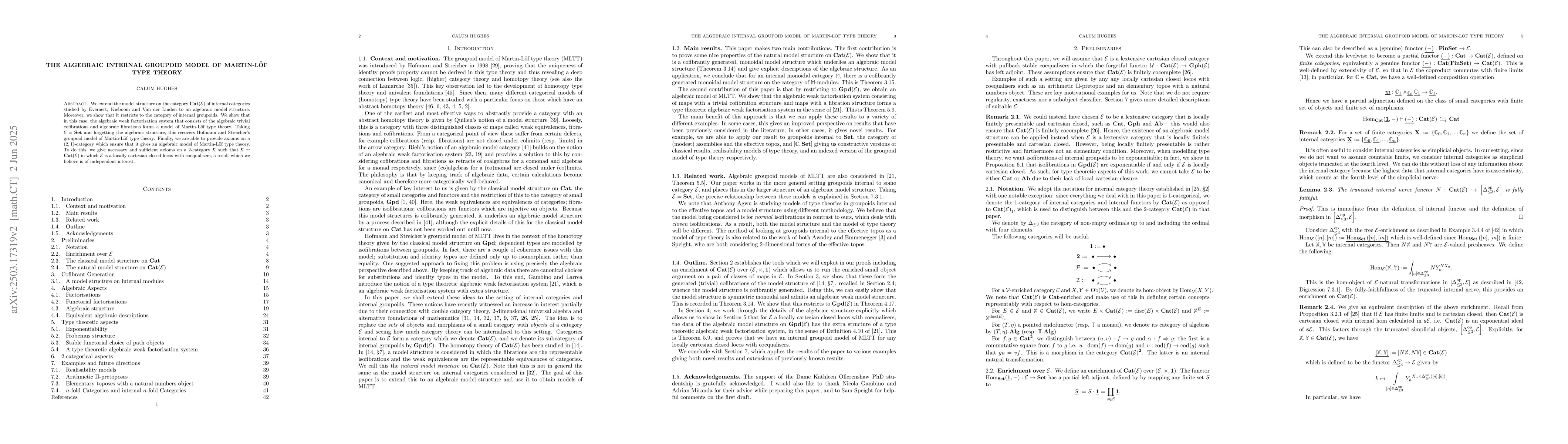 This work contributes to the understanding of algebraic models for type theories, specifically Martin-Löf type theory, by providing a new model based on internal groupoids and algebraic structures.