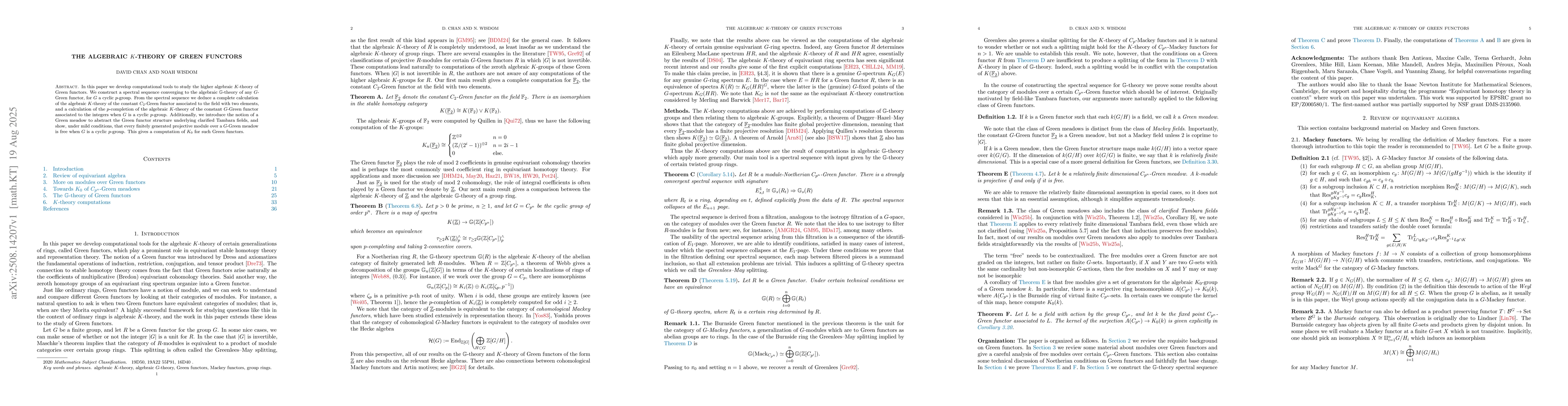 In this paper we develop computational tools to study the higher algebraic $K$-theory of Green functors. We construct a spectral sequence converging to the algebraic $\mathbb{G}$-theory of any $G$-Green functor, for $G$ a cyclic $p$-group. From the spectral sequence we deduce a complete calculation of the algebraic $K$-theory of the constant $C_2$-Green functor associated to the field with two elements, and a calculation of the $p$-completion of the algebraic $K$-theory of the constant $G$-Green functor associated to the integers when $G$ is a cyclic $p$-group. Additionally, we introduce the notion of a Green meadow to abstract the Green functor structure underlying clarified Tambara fields, and show, under mild conditions, that every finitely generated projective module over a $G$-Green meadow is free when $G$ is a cyclic $p$-group. This gives a computation of $K_0$ for such Green functors.