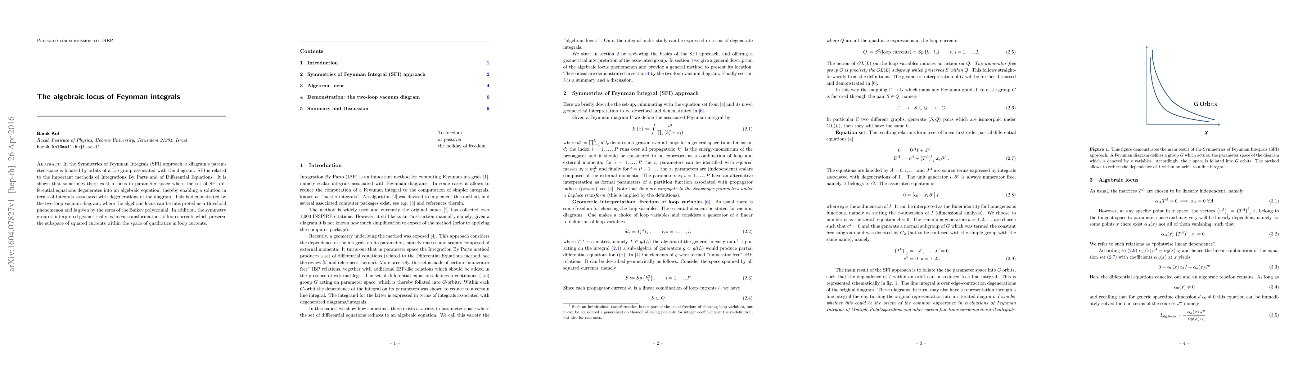 In the Symmetries of Feynman Integrals (SFI) approach, a diagram's parameter space is foliated by orbits of a Lie group associated with the diagram. SFI is related to the important methods of Integrations By Parts and of Differential Equations. It is shown that sometimes there exist a locus in parameter space where the set of SFI differential equations degenerates into an algebraic equation, thereby enabling a solution in terms of integrals associated with degenerations of the diagram. This is demonstrated by the two-loop vacuum diagram, where the algebraic locus can be interpreted as a threshold phenomenon and is given by the zeros of the Baikov polynomial. In addition, the symmetry group is interpreted geometrically as linear transformations of loop currents which preserve the subspace of squared currents within the space of quadratics in loop currents.