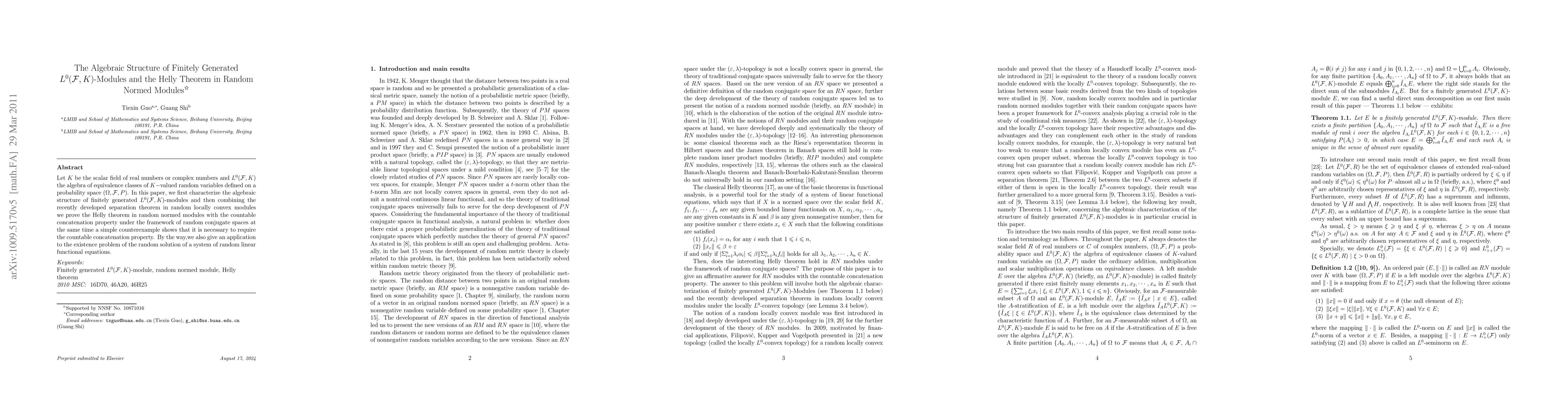 This paper explores the algebraic structure of finitely generated L^0(\mathcal{F},K)-modules and proves the Helly theorem in random normed modules with a countable concatenation property, showing its necessity.