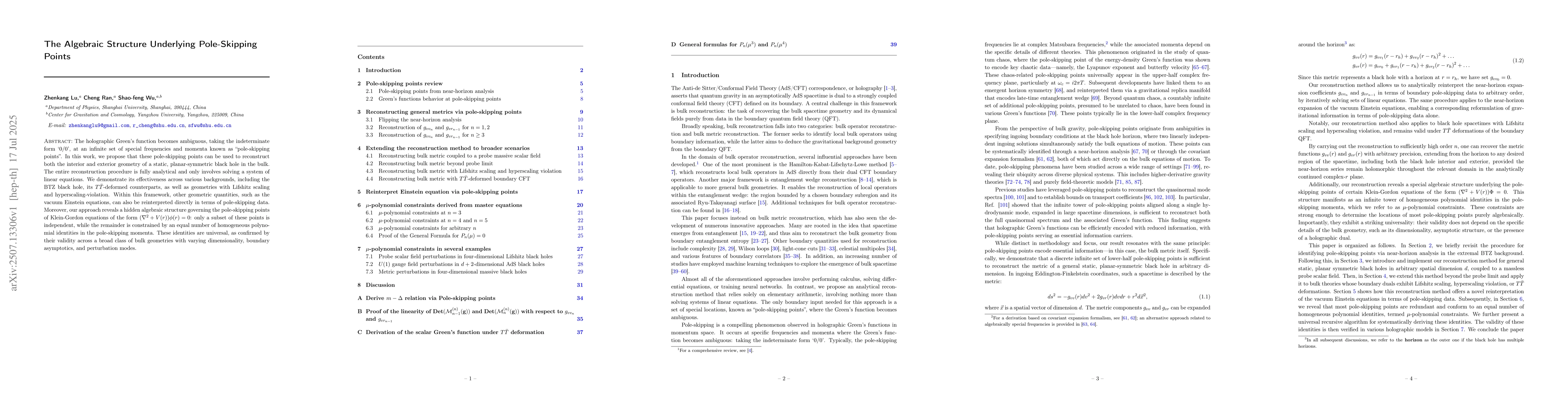 The holographic Green's function becomes ambiguous, taking the indeterminate form `$0/0$', at an infinite set of special frequencies and momenta known as ``pole-skipping points''. In this work, we propose that these pole-skipping points can be used to reconstruct both the interior and exterior geometry of a static, planar-symmetric black hole in the bulk. The entire reconstruction procedure is fully analytical and only involves solving a system of linear equations. We demonstrate its effectiveness across various backgrounds, including the BTZ black hole, its $T\bar{T}$-deformed counterparts, as well as geometries with Lifshitz scaling and hyperscaling-violation. Within this framework, other geometric quantities, such as the vacuum Einstein equations, can also be reinterpreted directly in terms of pole-skipping data. Moreover, our approach reveals a hidden algebraic structure governing the pole-skipping points of Klein-Gordon equations of the form $(\nabla^{2} + V(r))\phi(r) = 0$: only a subset of these points is independent, while the remainder is constrained by an equal number of homogeneous polynomial identities in the pole-skipping momenta. These identities are universal, as confirmed by their validity across a broad class of bulk geometries with varying dimensionality, boundary asymptotics, and perturbation modes.