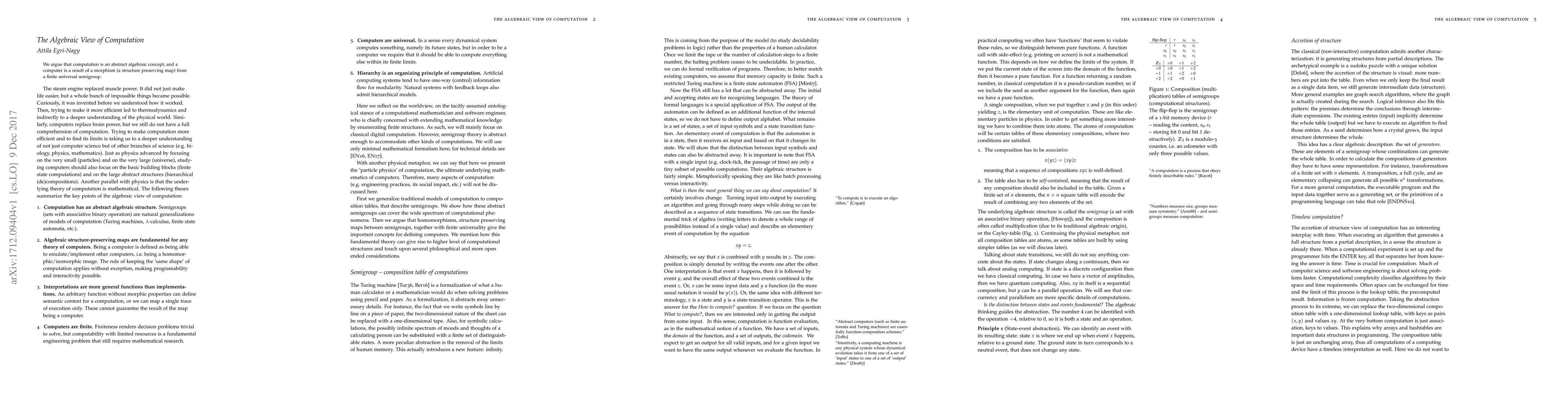 We argue that computation is an abstract algebraic concept, and a computer is a result of a morphism (a structure preserving map) from a finite universal semigroup.