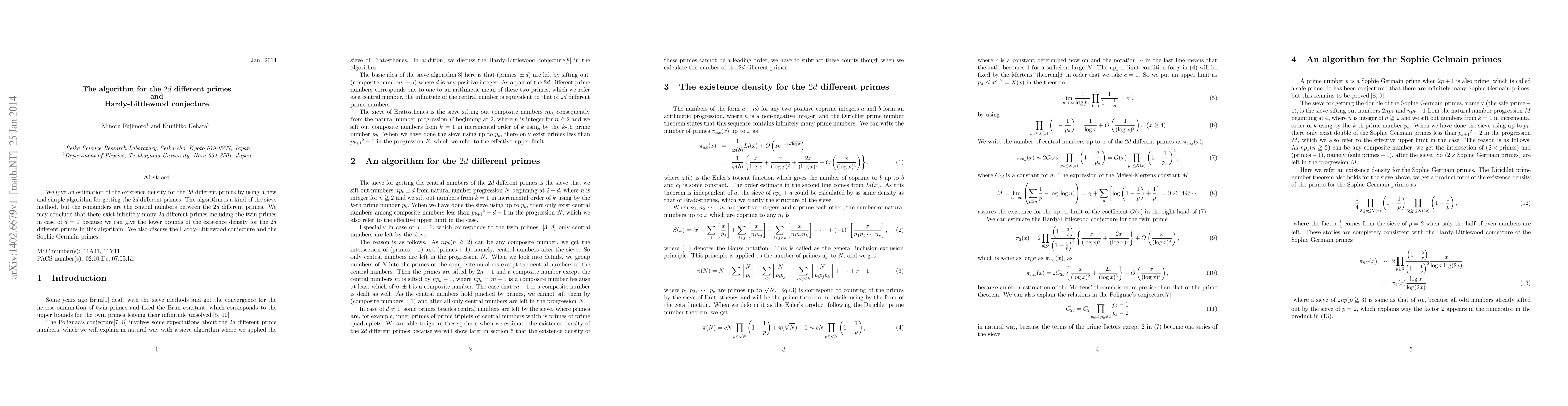 This paper introduces a new sieve algorithm to estimate the existence density of $2d$ different primes, showing that there are infinitely many such primes, including twin primes for $d=1$. The study also explores the Hardy-Littlewood conjecture and the properties of Sophie Germain primes.
