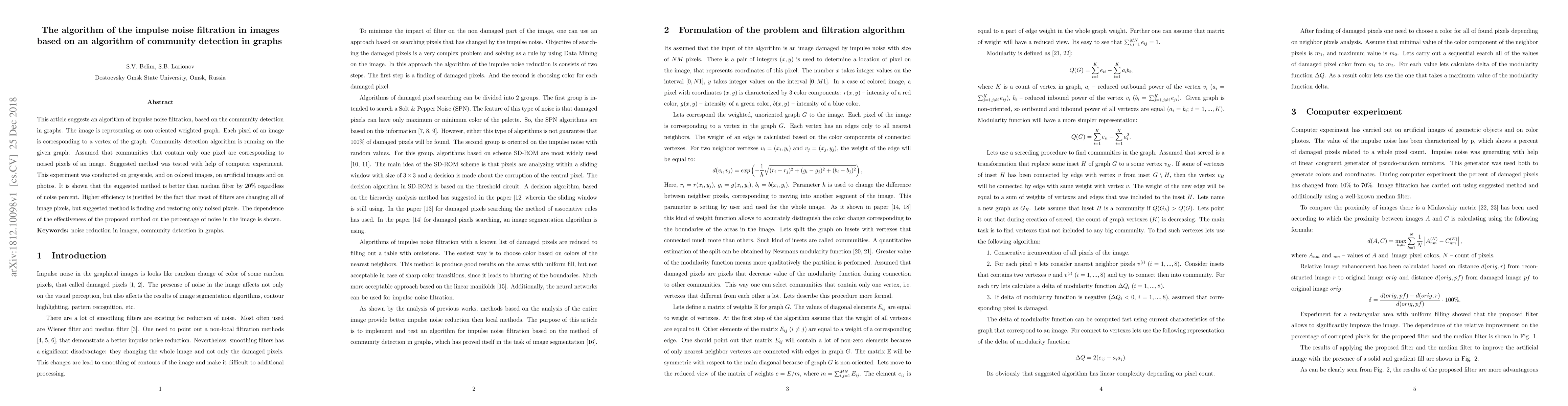 This article suggests an algorithm of impulse noise filtration, based on the community detection in graphs. The image is representing as non-oriented weighted graph. Each pixel of an image is corresponding to a vertex of the graph. Community detection algorithm is running on the given graph. Assumed that communities that contain only one pixel are corresponding to noised pixels of an image. Suggested method was tested with help of computer experiment. This experiment was conducted on grayscale, and on colored images, on artificial images and on photos. It is shown that the suggested method is better than median filter by 20% regardless of noise percent. Higher efficiency is justified by the fact that most of filters are changing all of image pixels, but suggested method is finding and restoring only noised pixels. The dependence of the effectiveness of the proposed method on the percentage of noise in the image is shown.