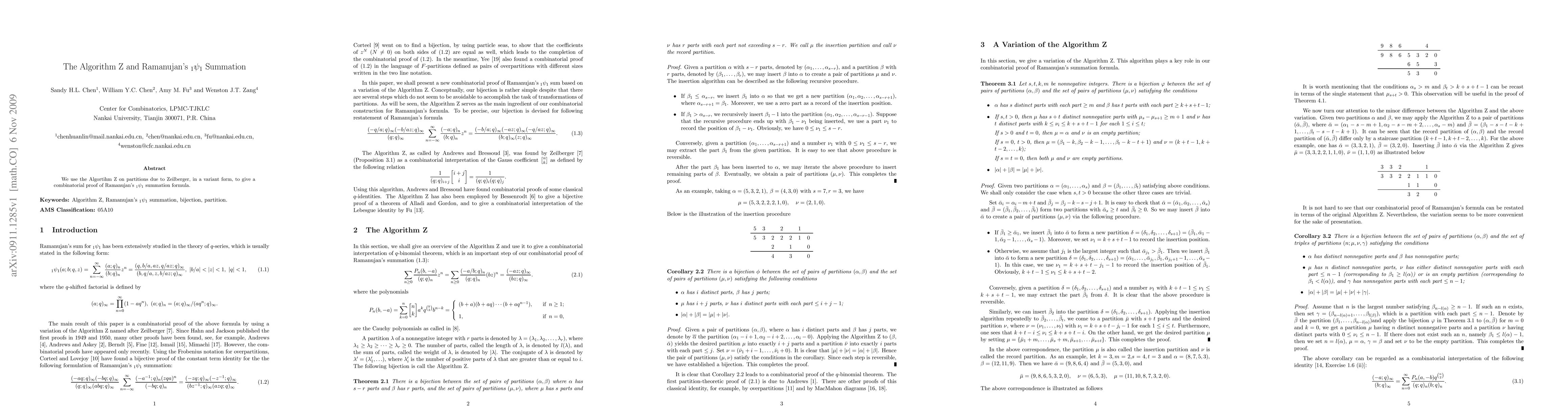 The research presents a distinct combinatorial approach using a tailored Algorithm Z variation, offering new insights into Ramanujan's $_1\psi_1$ summation formula and its relation to partition theory.
