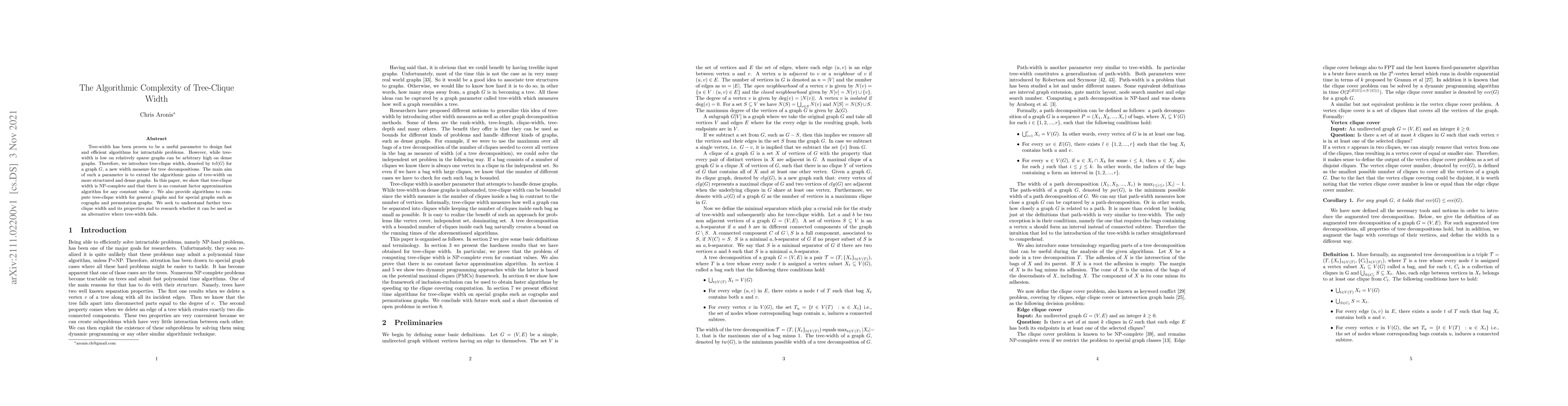 This paper introduces tree-clique width, a new parameter for tree decompositions, aiming to extend the algorithmic benefits of tree-width to denser graphs. The authors prove that computing tree-clique width is NP-complete and inapproximable, but provide algorithms for its computation on specific graph classes like cographs and permutation graphs.