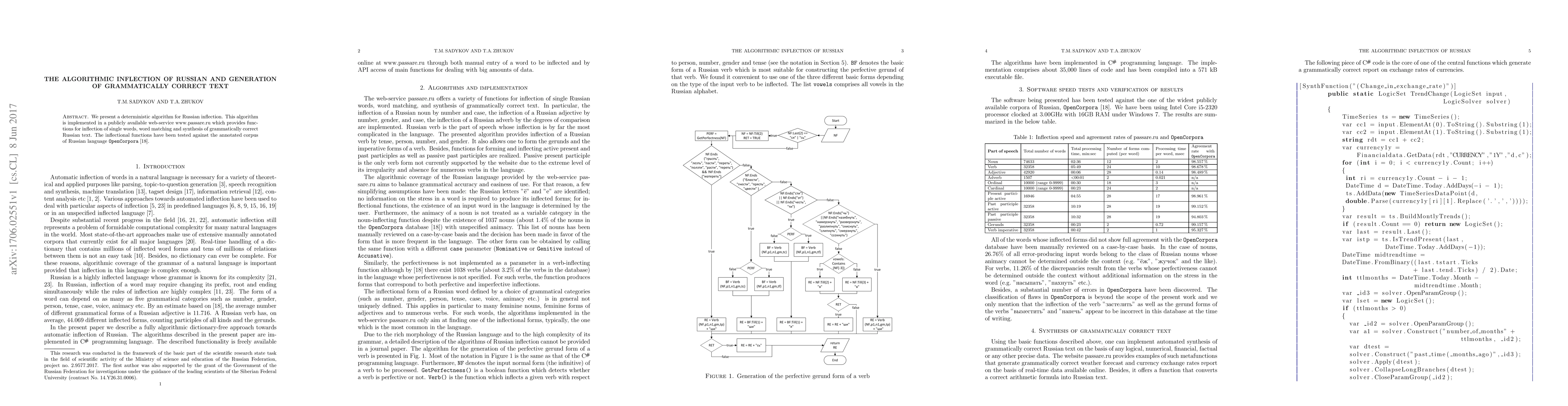 This paper introduces a deterministic algorithm for Russian inflection, implemented in a web-service (www.passare.ru) that offers word inflection, matching, and generation of grammatically correct Russian text. The algorithm's performance is validated using the OpenCorpora annotated Russian language corpus.