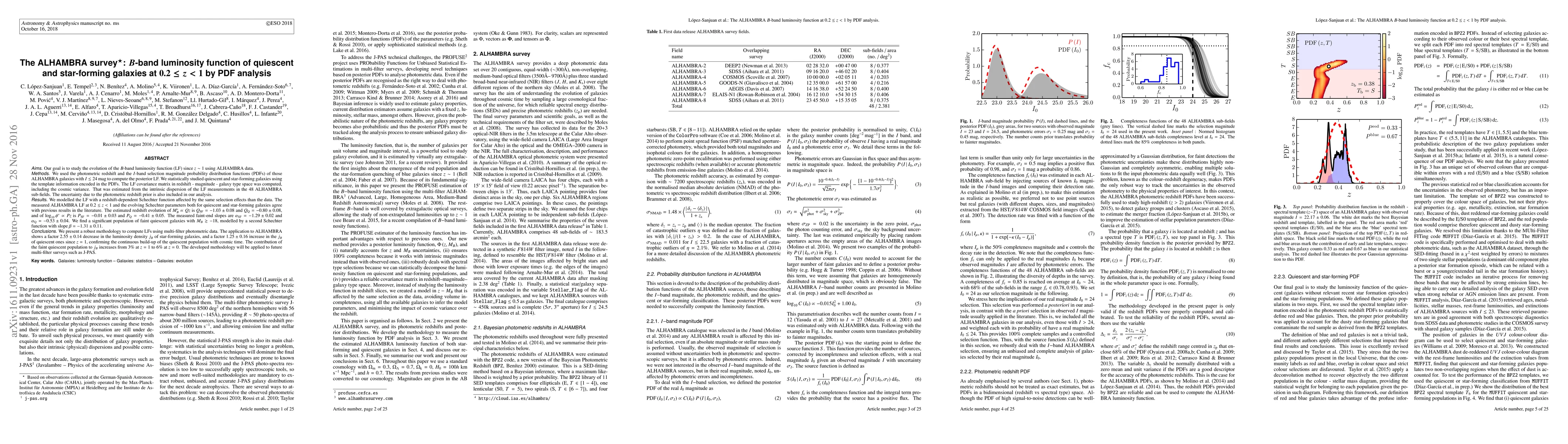 Our goal is to study the evolution of the $B-$band luminosity function (LF) since $z=1$ using ALHAMBRA data. We used the photometric redshift and the $I-$band selection magnitude probability distribution functions (PDFs) of those ALHAMBRA galaxies with $I\leq24$ mag to compute the posterior LF. We statistically studied quiescent and star-forming galaxies using the template information encoded in the PDFs. The LF covariance matrix in redshift-magnitude-galaxy type space was computed, including the cosmic variance. That was estimated from the intrinsic dispersion of the LF measurements in the 48 ALHAMBRA sub-fields. The uncertainty due to the photometric redshift prior is also included in our analysis. We modelled the LF with a redshift-dependent Schechter function affected by the same selection effects than the data. The measured ALHAMBRA LF at $0.2\leq z<1$ and the evolving Schechter parameters both for quiescent and star-forming galaxies agree with previous results in the literature. The estimated redshift evolution of $M_B^* \propto Qz$ is $Q_{\rm SF}=-1.03\pm0.08$ and $Q_{\rm Q}=-0.80\pm0.08$, and of $\log \phi^* \propto Pz$ is $P_{\rm SF}=-0.01\pm0.03$ and $P_{\rm Q}=-0.41\pm0.05$. The measured faint-end slopes are $\alpha_{\rm SF}=-1.29\pm0.02$ and $\alpha_{\rm Q}=-0.53\pm0.04$. We find a significant population of faint quiescent galaxies, modelled by a second Schechter function with slope $\beta=-1.31\pm0.11$. We find a factor $2.55\pm0.14$ decrease in the luminosity density $j_B$ of star-forming galaxies, and a factor $1.25\pm0.16$ increase in the $j_B$ of quiescent ones since $z=1$, confirming the continuous build-up of the quiescent population with cosmic time. The contribution of the faint quiescent population to $j_B$ increases from 3% at $z=1$ to 6% at $z=0$. The developed methodology will be applied to future multi-filter surveys such as J-PAS.