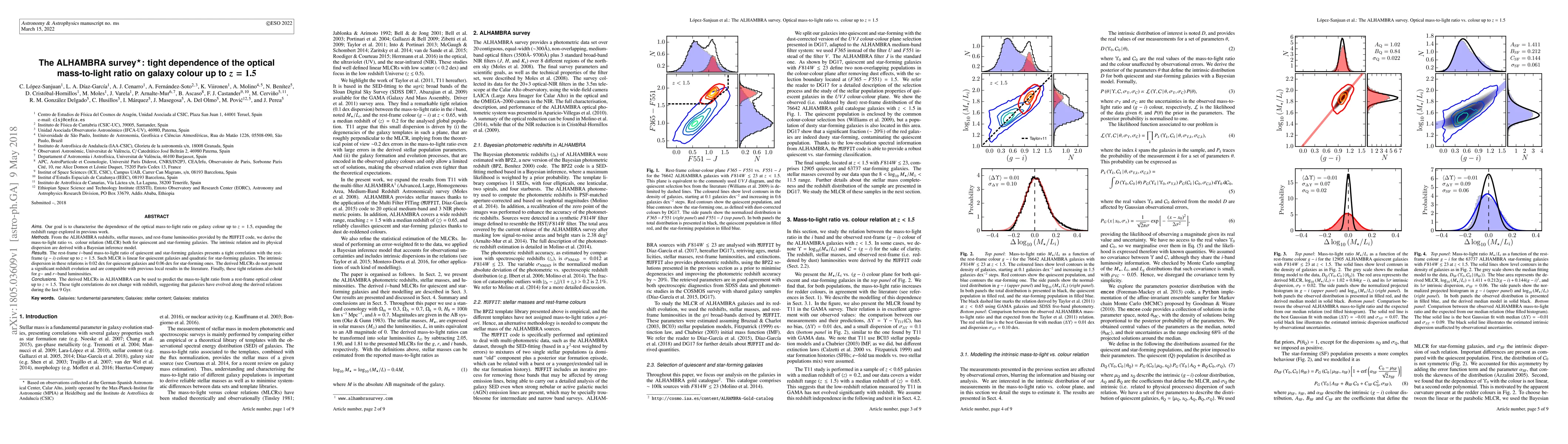 The ALHAMBRA survey reveals a strong correlation between the optical mass-to-light ratio and galaxy colour up to z = 1.5, showing linear and quadratic relationships for quiescent and star-forming galaxies, respectively, with minimal dispersion and no significant redshift evolution.