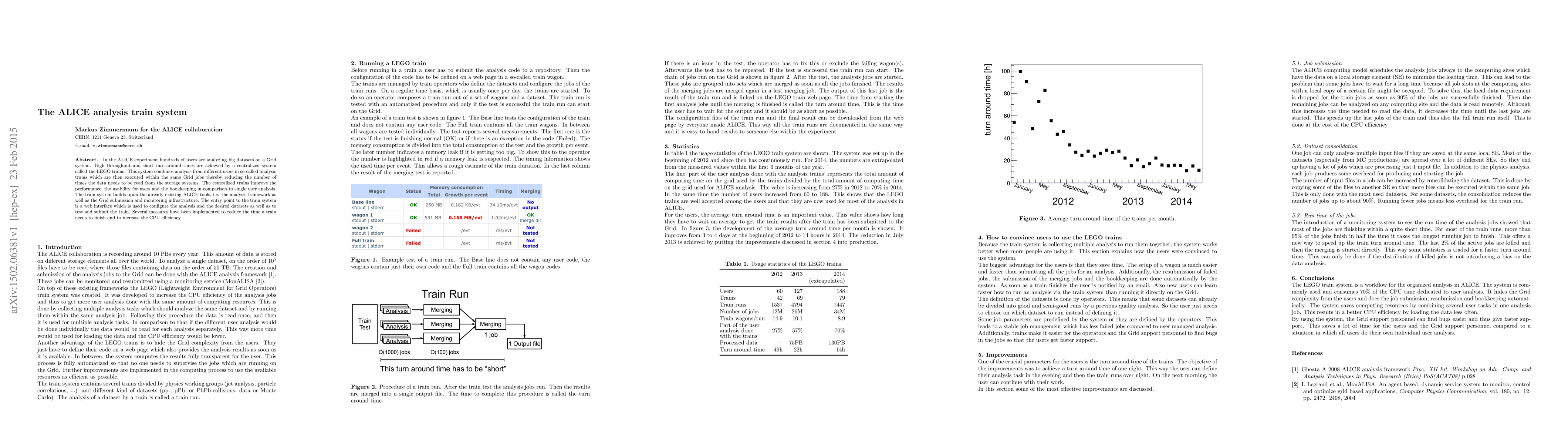 The ALICE analysis train system centralizes multiple users' analyses on a Grid, using "LEGO trains" to combine and execute analyses within the same Grid jobs, thereby enhancing performance and usability. The system leverages existing ALICE tools and features a web interface for configuration and submission, with measures to optimize efficiency and reduce completion times.