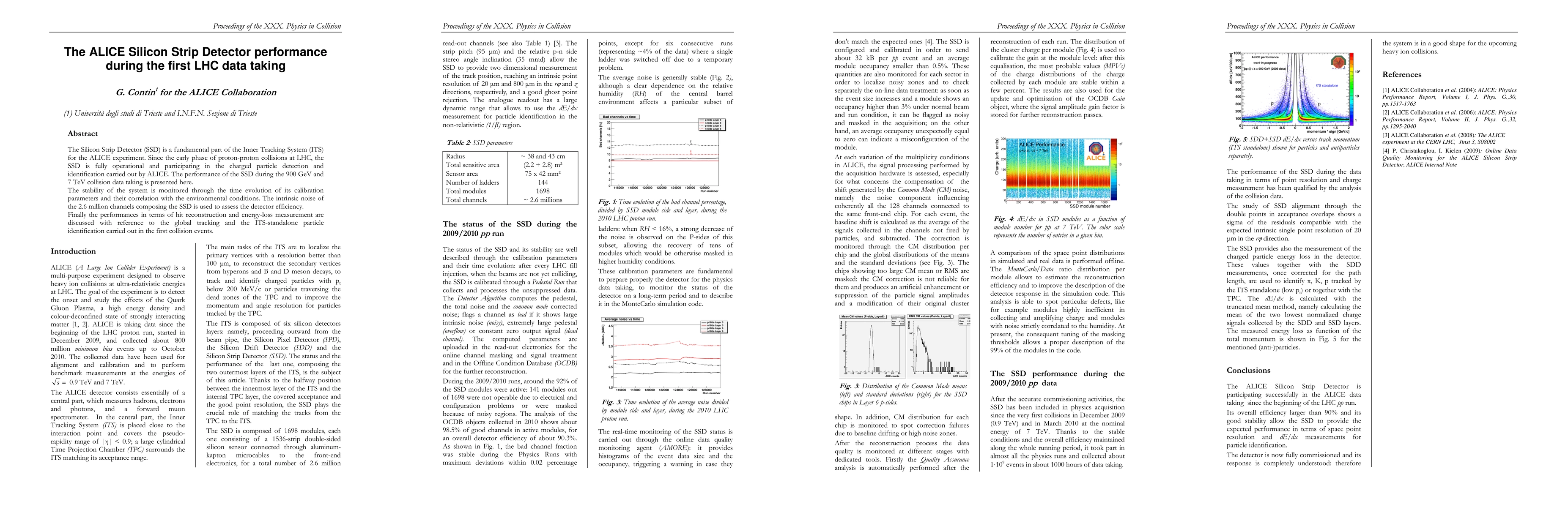 The ALICE Silicon Strip Detector (SSD) has demonstrated full operational capability during the first LHC proton-proton collision data taking at 900 GeV and 7 TeV, contributing to charged particle detection and identification. Performance stability and efficiency are assessed through calibration parameters and intrinsic noise analysis, with successful hit reconstruction and energy-loss measurement in global tracking and standalone particle identification.
