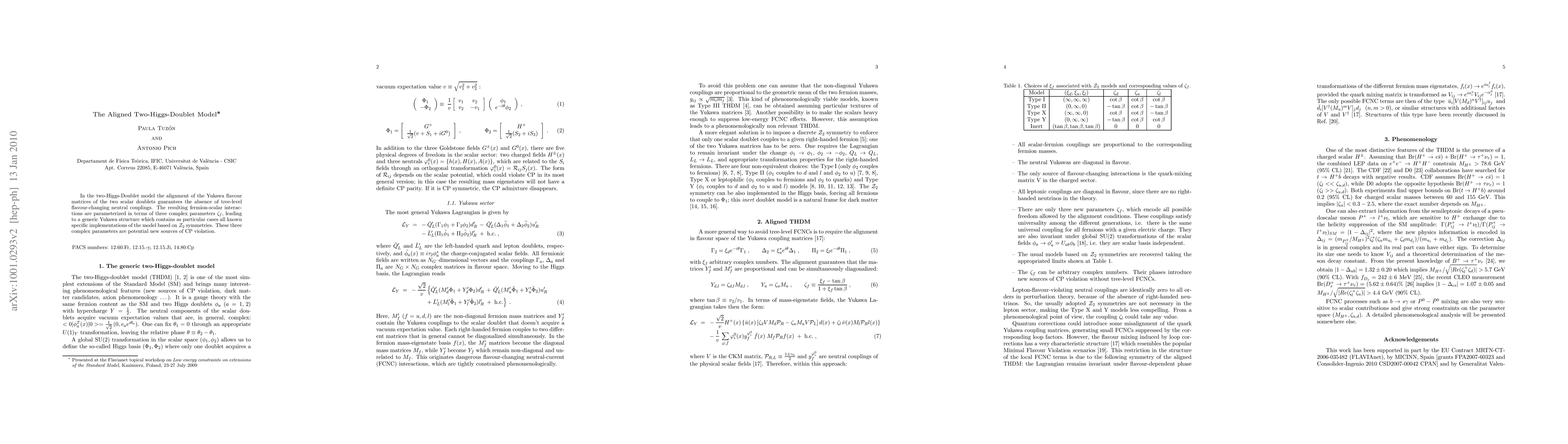 Summary: The Aligned two-Higgs Doublet model ensures no tree-level flavour-changing neutral couplings by aligning Yukawa flavour matrices, parameterized by three complex parameters that may introduce CP violation. This model encompasses various known implementations based on Z2 symmetries.