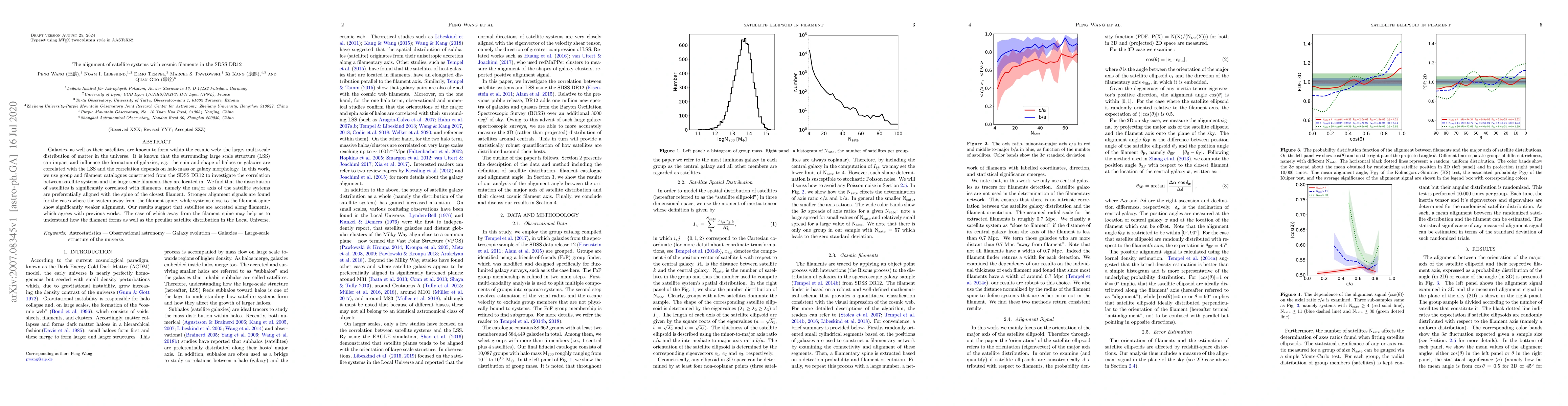 Galaxies, as well as their satellites, are known to form within the cosmic web: the large, multi-scale distribution of matter in the universe. It is known that the surrounding large scale structure (LSS) can impact and influence the formation of galaxies, e.g. the spin and shape of haloes or galaxies are correlated with the LSS and the correlation depends on halo mass or galaxy morphology. In this work, we use group and filament catalogues constructed from the SDSS DR12 to investigate the correlation between satellite systems and the large scale filaments they are located in. We find that the distribution of satellites is significantly correlated with filaments, namely the major axis of the satellite systems are preferentially aligned with the spine of the closest filament. Stronger alignment signals are found for the cases where the system away from the filament spine, while systems close to the filament spine show significantly weaker alignment. Our results suggest that satellites are accreted along filaments, which agrees with previous works. The case of which away from the filament spine may help us to understand how the filament forms as well as the peculiar satellite distribution in the Local Universe.