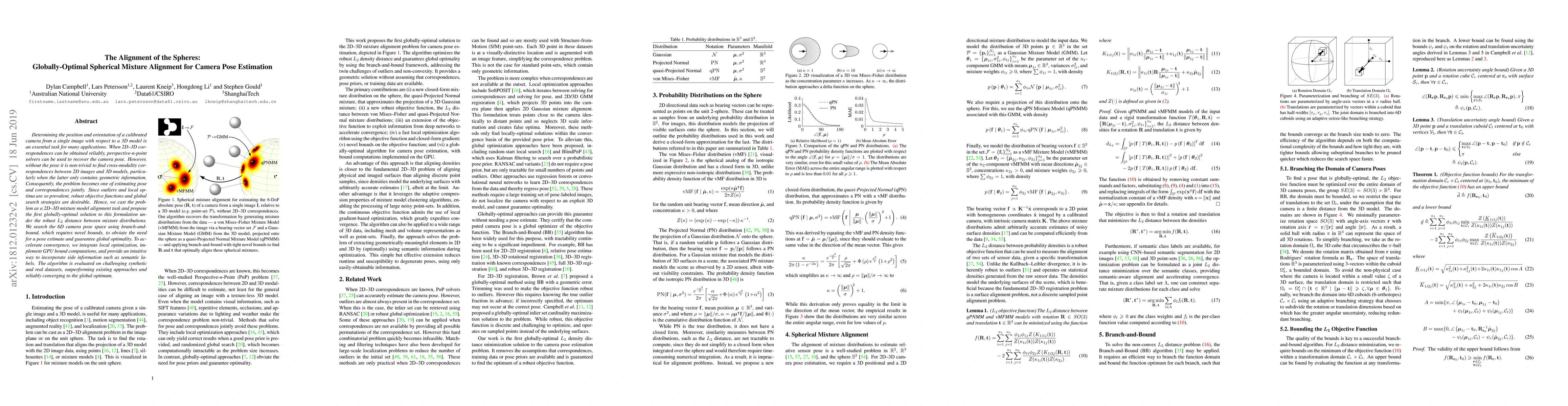 This paper presents a globally-optimal spherical mixture alignment method for camera pose estimation using a robust $L_2$ distance. It employs branch-and-bound to search the 6D pose space, integrating local optimization and GPU-based computations for efficiency, and outperforms existing methods on synthetic and real datasets.