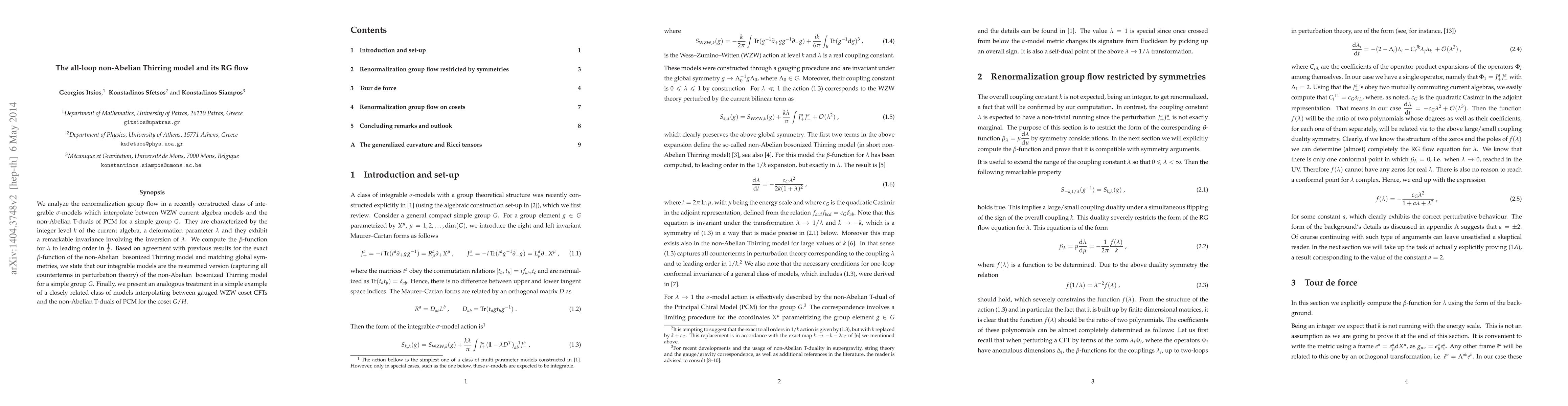 This paper investigates the renormalization group flow in a new class of integrable sigma-models, showing they capture all counterterms of the non-Abelian Thirring model. The authors compute the beta-function and demonstrate that these models represent the resummed version of the non-Abelian bosonized Thirring model, validated by matching symmetries and previous exact beta-function results.