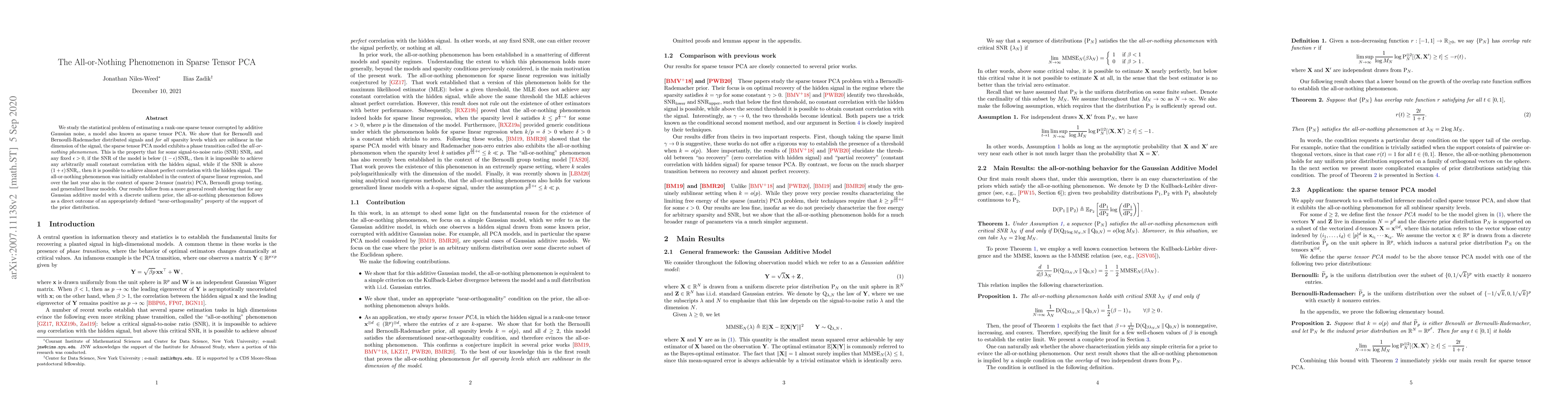 This paper investigates the statistical estimation of a rank-one sparse tensor under Gaussian noise, revealing an all-or-nothing phenomenon for sublinear sparsity levels. It demonstrates a phase transition where, below a critical SNR, no correlation with the hidden signal can be achieved, while above it, almost perfect correlation is possible.