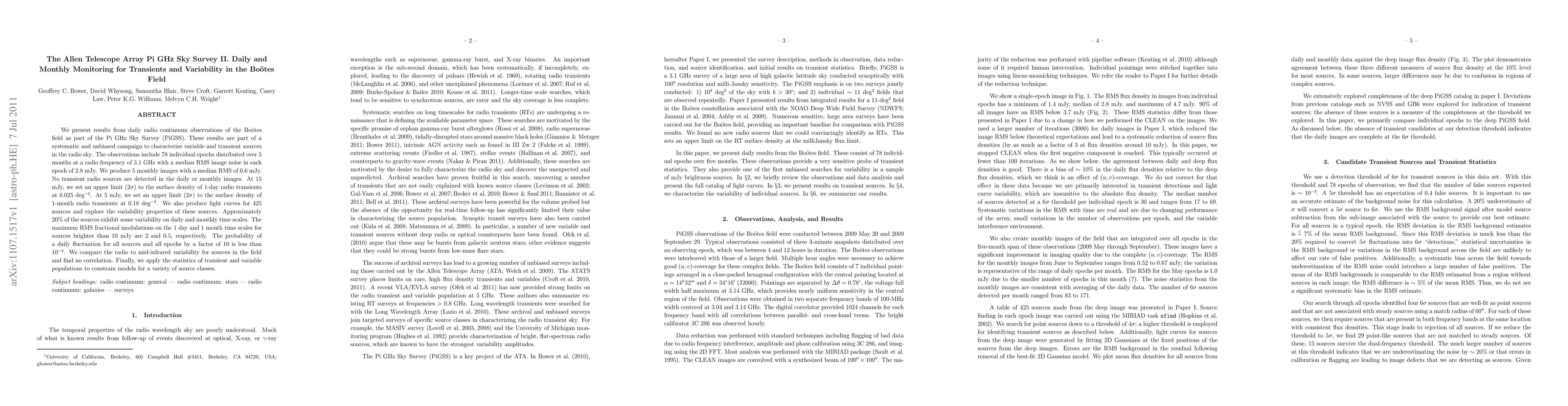We present results from daily radio continuum observations of the Bootes field as part of the Pi GHz Sky Survey (PiGSS). These results are part of a systematic and unbiased campaign to characterize variable and transient sources in the radio sky. The observations include 78 individual epochs distributed over 5 months at a radio frequency of 3.1 GHz with a median RMS image noise in each epoch of 2.8 mJy. We produce 5 monthly images with a median RMS of 0.6 mJy. No transient radio sources are detected in the daily or monthly images. At 15 mJy, we set an upper limit (2 sigma) to the surface density of 1-day radio transients at 0.025 deg^-2. At 5 mJy, we set an upper limit (2\sigma) to the surface density of 1-month radio transients at 0.18 deg^-2. We also produce light curves for 425 sources and explore the variability properties of these sources. Approximately 20% of the sources exhibit some variability on daily and monthly time scales. The maximum RMS fractional modulations on the 1 day and 1 month time scales for sources brighter than 10 mJy are 2 and 0.5, respectively. The probability of a daily fluctuation for all sources and all epochs by a factor of 10 is less than 10^-4. We compare the radio to mid-infrared variability for sources in the field and find no correlation. Finally, we apply the statistics of transient and variable populations to constrain models for a variety of source classes.