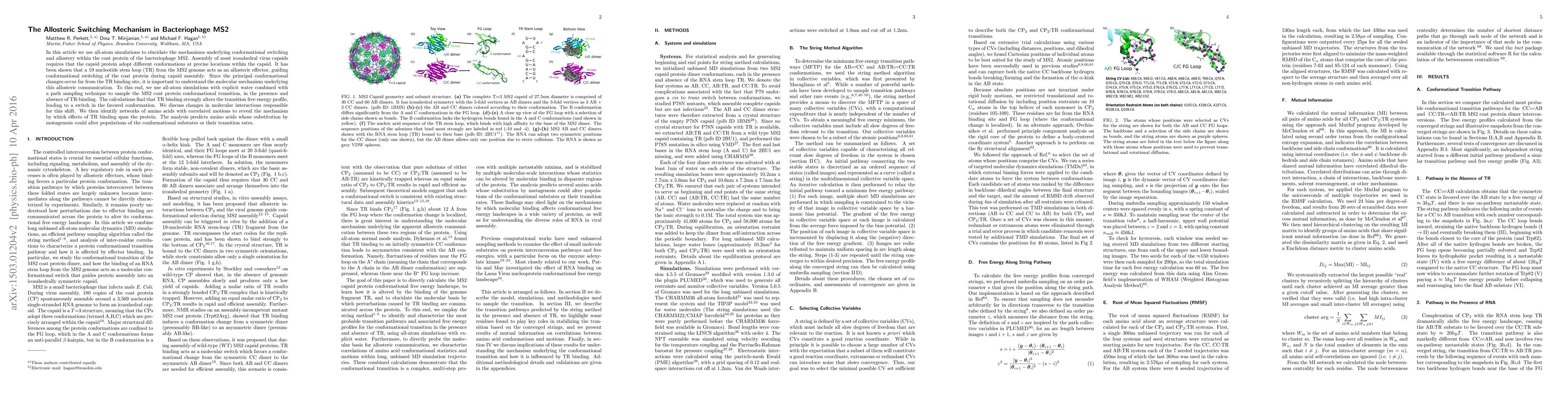 This paper uses all-atom simulations to investigate the allosteric switching mechanism in the MS2 bacteriophage coat protein, revealing how a 19 nucleotide stem loop (TR) alters the protein's conformational transition and identifies amino acid networks that mediate this allosteric communication. The study predicts specific mutations that could modify the protein's conformational states.