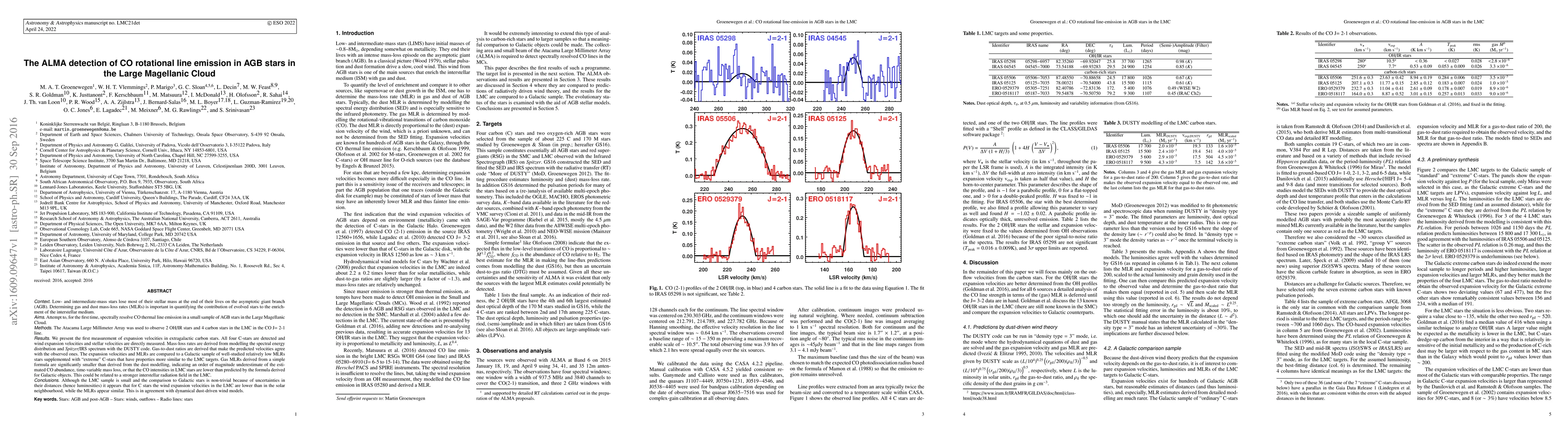Context: Low- and intermediate-mass stars lose most of their stellar mass at the end of their lives on the asymptotic giant branch (AGB). Determining gas and dust mass-loss rates (MLRs) is important in quantifying the contribution of evolved stars to the enrichment of the interstellar medium. Aims: Attempt to, for the first time, spectrally resolve CO thermal line emission in a small sample of AGB stars in the Large Magellanic Cloud. Methods: ALMA was used to observe 2 OH/IR stars and 4 carbon stars in the LMC in the CO J= 2-1 line. Results: We present the first measurement of expansion velocities in extragalactic carbon stars. All four C-stars are detected and wind expansion velocities and stellar velocities are directly measured. Mass-loss rates are derived from modelling the spectral energy distribution and Spitzer/IRS spectrum with the DUSTY code. Gas-to-dust ratios are derived that make the predicted velocities agree with the observed ones. The expansion velocities and MLRs are compared to a Galactic sample of well-studied relatively low MLRs stars supplemented with "extreme" C-stars that have properties more similar to the LMC targets. Gas MLRs derived from a simple formula are significantly smaller than derived from the dust modelling, indicating an order of magnitude underestimate of the estimated CO abundance, time-variable mass loss, or that the CO intensities in LMC stars are lower than predicted by the formula derived for Galactic objects. This could be related to a stronger interstellar radiation field in the LMC. Conclusions: Although the LMC sample is small and the comparison to Galactic stars is non-trivial because of uncertainties in their distances it appears that for C stars the wind expansion velocities in the LMC are lower than in the solar neighbourhood, while the MLRs appear similar. This is in agreement with dynamical dust-driven wind models.